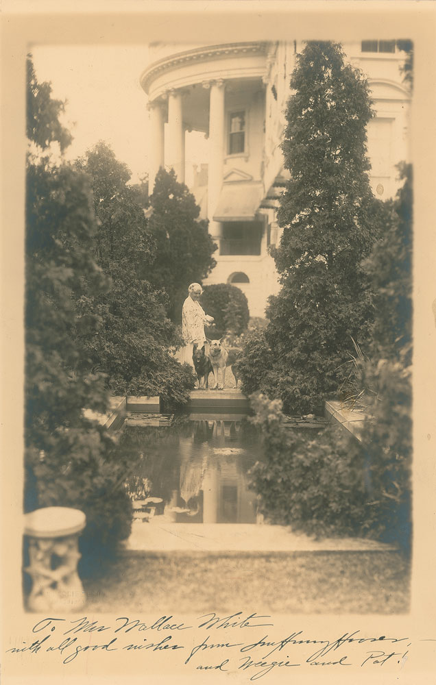Vintage matte-finish 7 x 10.75 photo of the first lady with her dogs in the White House gardens, signed and inscribed in the lower border in fountain pen, "To Mrs. Wallace White, with all good wishes from Lou Henry Hoover, and Weegie and Pat!” Blindstamped in the lower left corner by Harris & Ewing. In fine condition, with trimmed edges. From the Collection of Dr. Lawrence E. Miller.