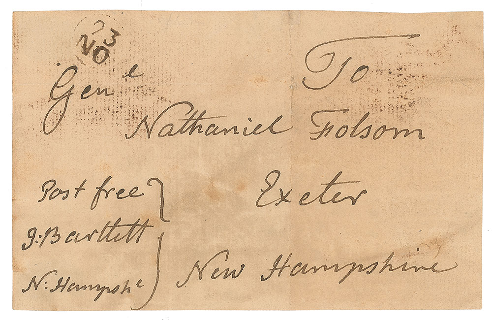 Physician and signer of the Declaration of Independence from New Hampshire (1729-1795) who served as that state's governor from 1790 to 1794. Desirable hand-addressed and free-franked mailing panel, 5.25 x 3.5, addressed by Bartlett to "Gen'l Nathaniel Folsom, Exeter, New Hampshire," and franked in the lower left corner, "Post free, J: Bartlett, N: Hampshire." In very good to fine condition, with some creasing and soiling. A merchant and statesman, Folsom served as a delegate for New Hampshire in the Continental Congress, as well as the major general of the New Hampshire Militia. From the Collection of Dr. Lawrence E. Miller.