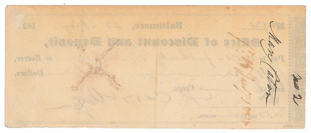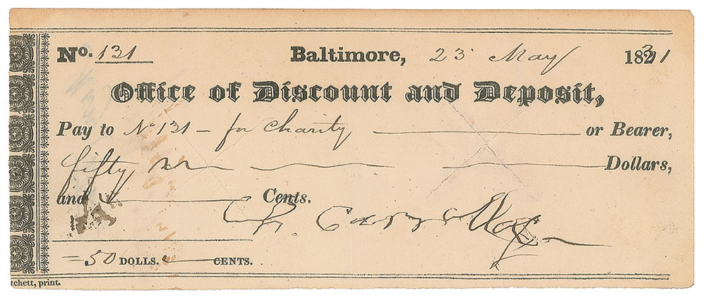 Signer of the Declaration of Independence from Maryland (1737-1832) who was the longest-lived among his colleagues. Baltimore Office of Discount and Deposit check, 6.5 x 2.5, filled out in another hand and signed by Carroll, "Ch. Carroll," payable to "No. 131—for Charity" for $50, June 23, 1831. In fine condition. From the Collection of Dr. Lawrence E. Miller.