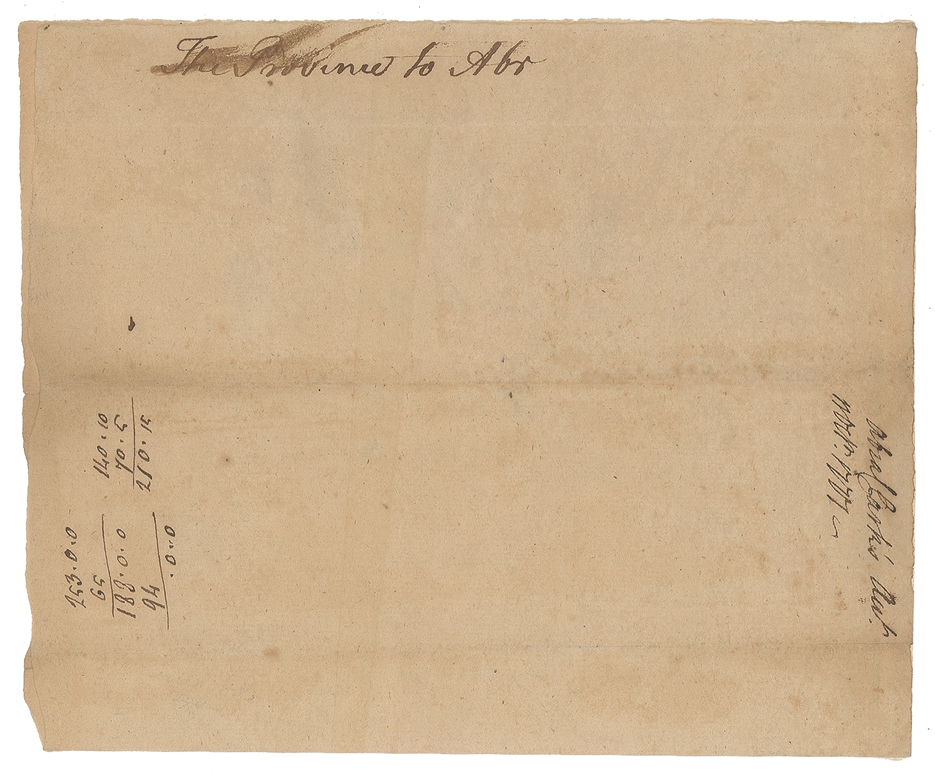 Signer of the Declaration of Independence from New Jersey (1726-1794), who represented his state in the Continental Congress. Revolutionary War-dated ADS, signed “Abra. Clark” and "Abraham Clark," one page, 7.5 x 6.25, docketed November 1777 on the reverse. Clark's handwritten account document, signed in the third-person within the text, and at the conclusion. In full: "The State of New Jersey to Abraham Clark Dr., To 171 days attendance in Congress from the 14th of March last to the 22d Sept'r last, including 15 days absent going home, there, & returning and six days with the Assembly at Haddonfield—£171.0.0, Cr. to 450 Dollars being paid of 1000 Dollars I claimed for the Delegrates—168.15.0, Balance £2.50." An "Additional Allowance" amounting to £85.10.0 has been added in another hand. In fine condition, with a thin mounting strip along the back of the left edge. A highly desirable twice-signed document associated with Clark's time in the Continental Congress, where he had voted to adopt the Declaration of Independence in 1776. From the Collection of Dr. Lawrence E. Miller.