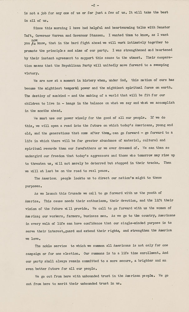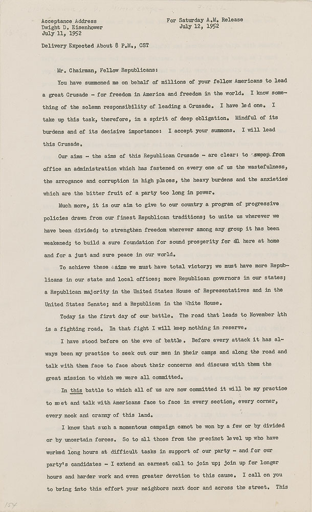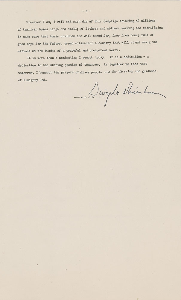 Scarce souvenir typescript of Dwight D. Eisenhower's "Acceptance Address" for the Presidential Nomination, given at the Republican National Convention in Chicago on July 11, 1952, three pages, 8.5 x 14, signed at the conclusion in black ink by Eisenhower. A portion of the speech is as follows: "You have summoned me on behalf of millions of your fellow Americans to lead a great Crusade—for freedom in America and freedom in the world. I know something of the solemn responsibility of leading a Crusade. I have led one. I take up this task, therefore, in a spirit of deep obligation. Mindful of its burdens and of its decisive importance: I accept your summons. I will lead this crusade…Today is the first day of our battle. The road that leads to Nov. 4th is a fighting road. In that fight I will keep nothing in reserve. I have stood before on the eve of battle. Before every attack it has always been my practice to seek out our men in their camps and along the road and talk with them face to face about their concerns and discuss with them the great mission to which we were all committed. In this battle to which all of us are now committed it will be my practice to meet and talk with Americans face to face in every section, every corner, every nook and cranny of this land…Wherever I am, I will end each day of this campaign thinking of millions of American homes large and small; of fathers and mothers working and sacrificing to make sure that their children are well cared for, free from fear; full of good hope for the future, proud citizens of a country that will stand among the nations as the leader of a peaceful and prosperous world. It is more than a nomination I accept today. It is a dedication—a dedication to the shining promise of tomorrow. As together we face that tomorrow, I beseech the prayers of all our people and the blessing and guidance of Almighty God." In fine condition. From the Collection of Dr. Lawrence E. Miller.