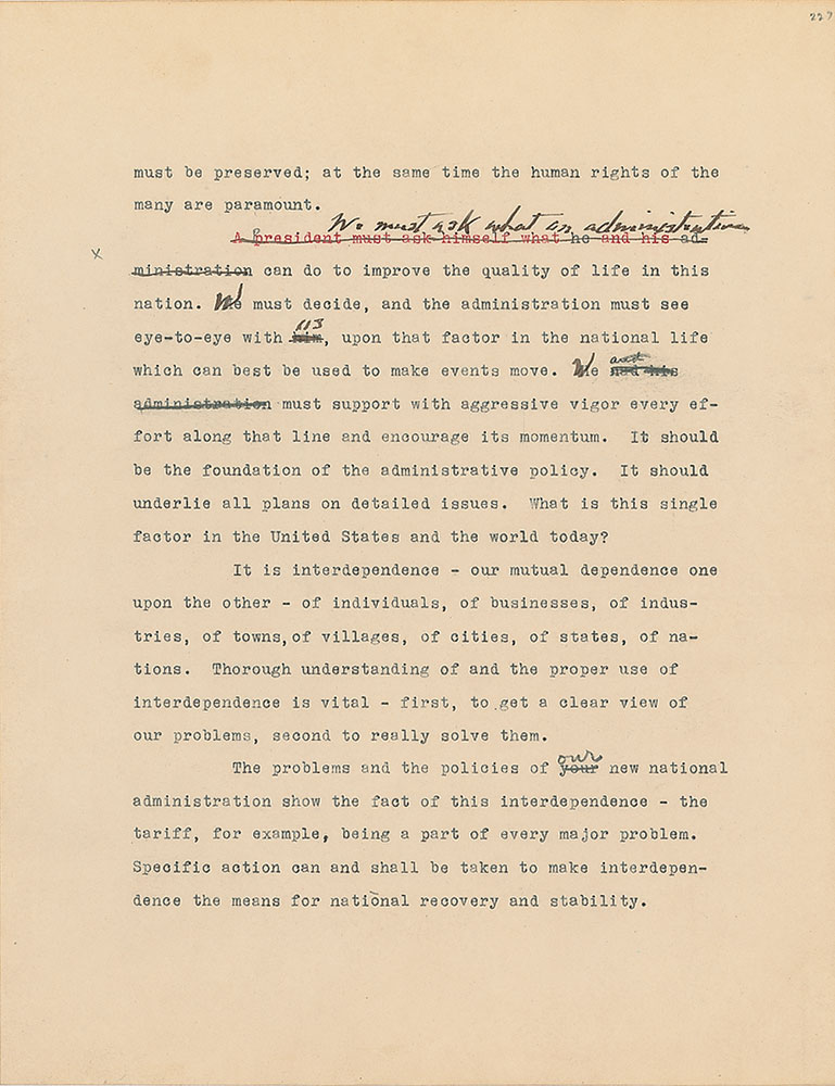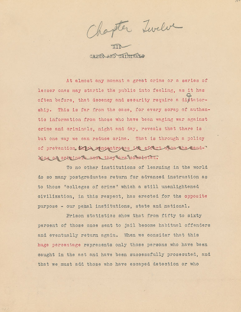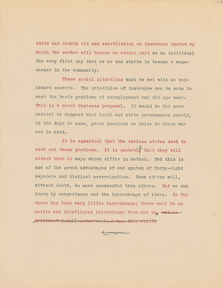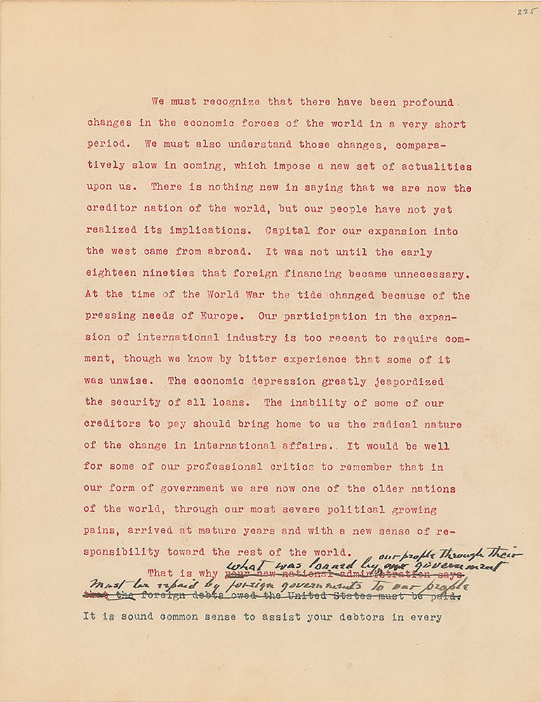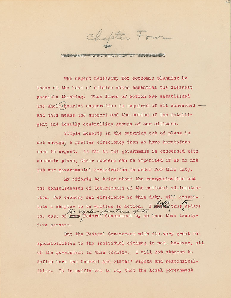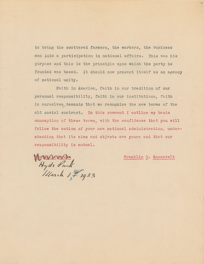 Roosevelt prepared this manuscript—outlining his progressive vision for America's 'New Deal'—while president-elect in 1933, drawing from various speeches and writings crafted during his candidacy. It was published in the month of his inauguration, March 1933, and quickly became a New York Times bestseller. With chapter headings like "Reappraisal of Values," "Need for Economic Planning," "Reorganization of Government," "Expenditure and Taxation," "The Power Issue," "Banking and Speculation," and "National and International Unity," the soon-to-be president lays out his plans for the country. An important hand-corrected manuscript from the revered head of state. From the Collection of Dr. Lawrence E. Miller.