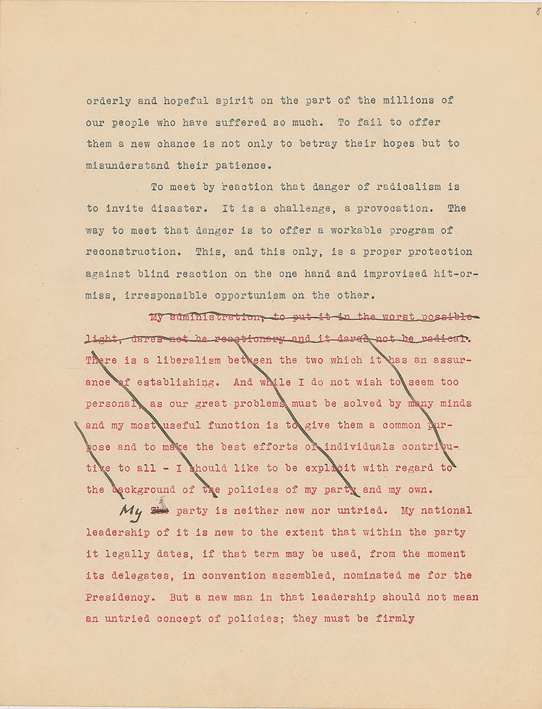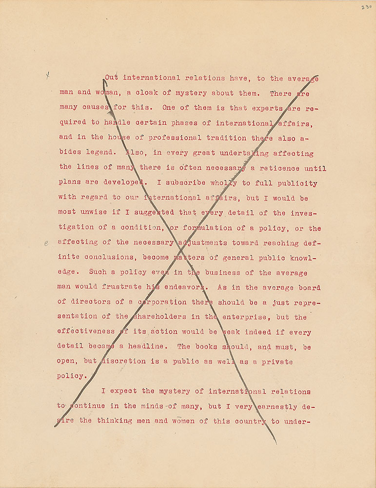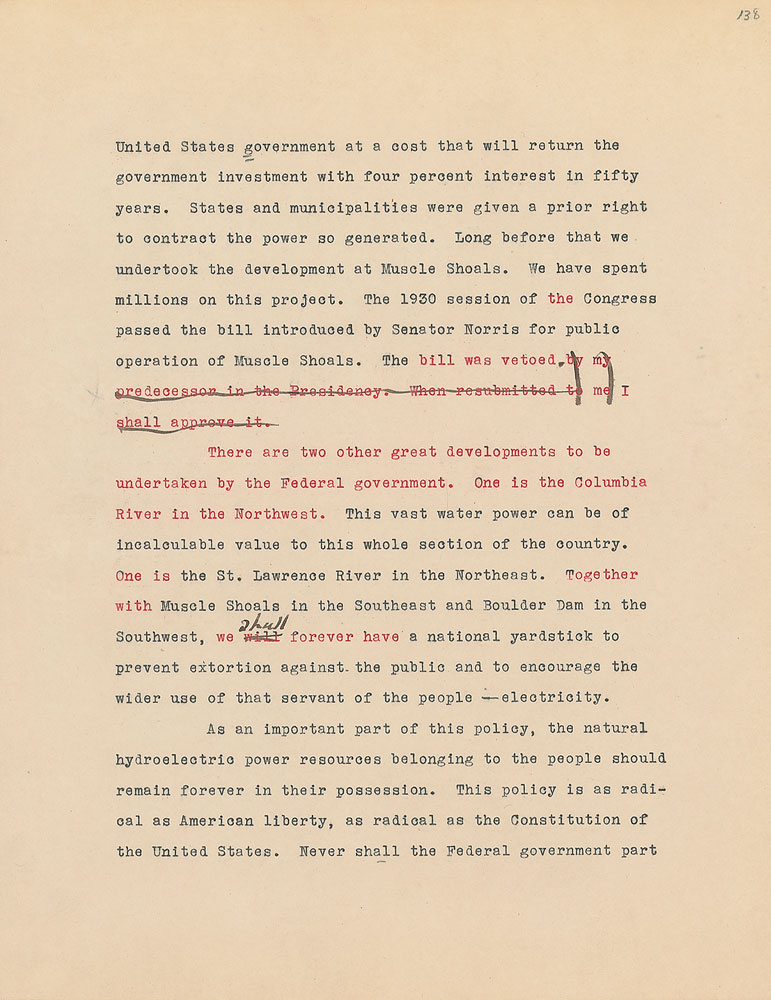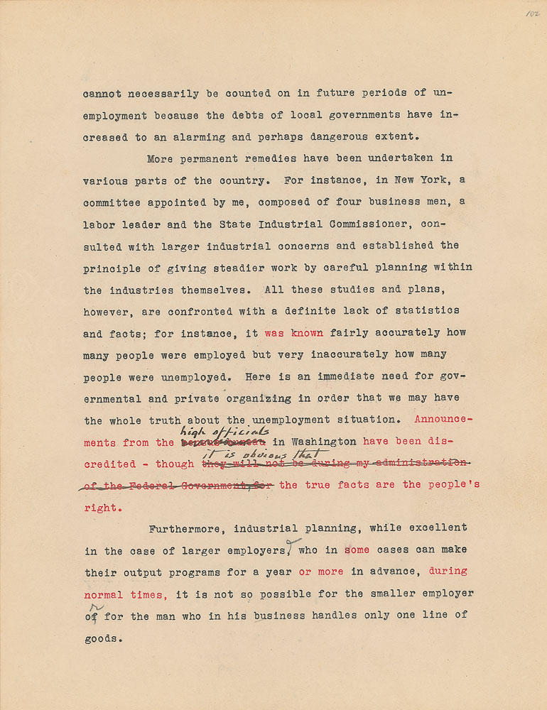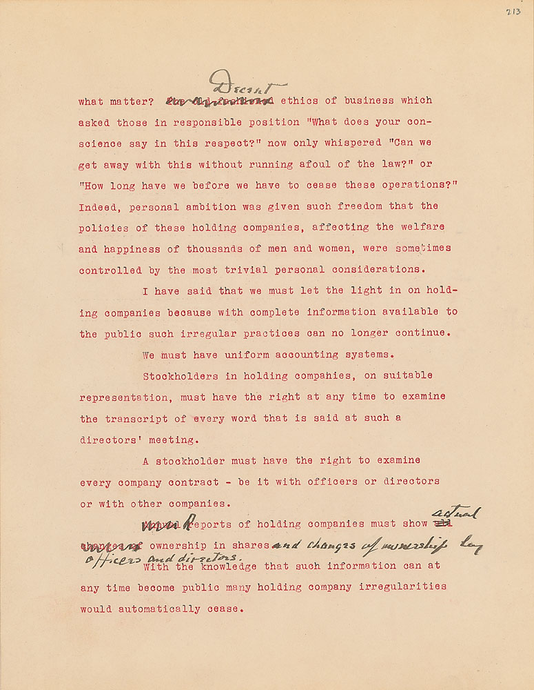 Roosevelt prepared this manuscript—outlining his progressive vision for America's 'New Deal'—while president-elect in 1933, drawing from various speeches and writings crafted during his candidacy. It was published in the month of his inauguration, March 1933, and quickly became a New York Times bestseller. With chapter headings like "Reappraisal of Values," "Need for Economic Planning," "Reorganization of Government," "Expenditure and Taxation," "The Power Issue," "Banking and Speculation," and "National and International Unity," the soon-to-be president lays out his plans for the country. An important hand-corrected manuscript from the revered head of state. From the Collection of Dr. Lawrence E. Miller.