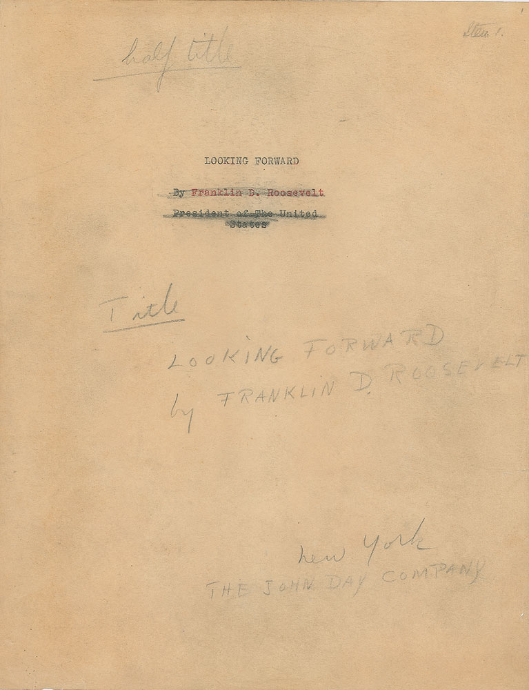 Hand-corrected typed manuscript draft of Franklin D. Roosevelt's 1933 book Looking Forward, 235 pages housed in a black 11.75 x 11.5 binder, featuring Roosevelt's handwritten corrections in ink on 22 pages; the draft also bears numerous pencil corrections in an unknown hand. FDR's lengthiest addition comes at the top of the first page of text, in full: "This is essentially a compilation from many articles written and speeches made prior to March 1, 1933. I have added parts which bind the material together as a whole." Most of his other revisions are minor, often an addition of quotes or a couple of words, or some cross outs to passages: for example, on page four, he strikes through one paragraph and changes the word "The" to "My." At the end of the introduction, he also strikes through "The White House," replacing it with "Hyde Park, March 1st 1933"—three days before he would be inaugurated as president of the United States. In overall fine condition.