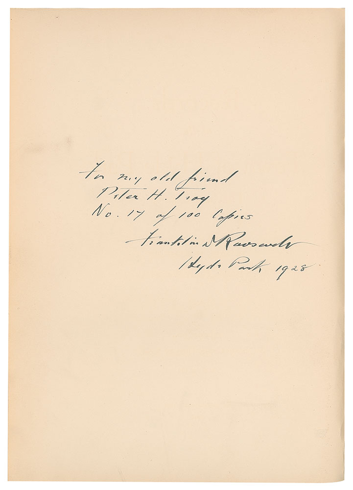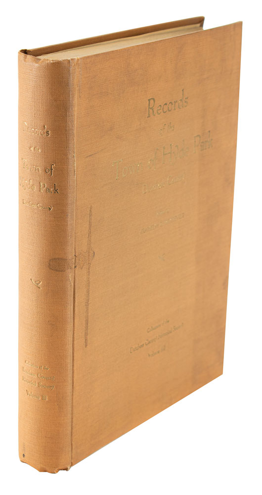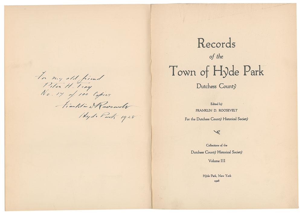 Rare signed book: Records of the Town of Hyde Park, Duchess County, Vol. III. First edition, limited issue, numbered 17/100. Hyde Park, NY: Duchess County Historical Society, 1928. Hardcover bound in brown cloth with gilt stamping, 8.5 x 11, 340 pages. Numbered, signed, and inscribed opposite the title page in fountain pen, "For my old friend Peter H. Troy, No. 17 of 100 Copies, Franklin D. Roosevelt, Hyde Park 1928." Autographic condition: fine. Book condition: VG/None, with a cracked front hinge, small stains to front board and spine, and a "Library of Lawrence E. Miller" blindstamp to the last page. From the Collection of Dr. Lawrence E. Miller.