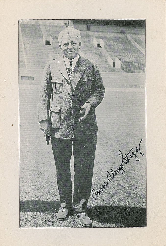 Renowned athletic coach (1862-1965) whose versatile skills earned him places in both the College Football Hall of Fame and the Basketball Hall of Fame. Vintage semi-glossy 5.25 x 7.75 book photo of Amos Alonzo Stagg holding a pistol and timer on the track field at the University of Chicago, signed in bold black ink. In fine condition.