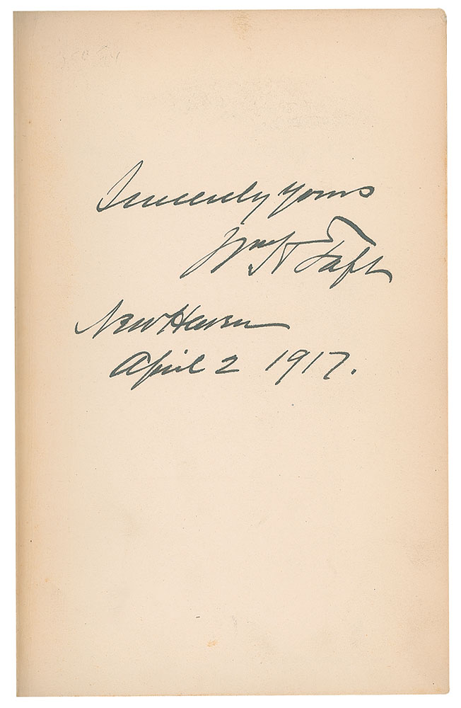 Signed book: Presidential Addresses and State Papers. First edition. NY: Doubleday, Page & Company, 1910. Hardcover bound in green cloth with gilt stamping, 5.5 x 8, 612 pages. Signed on the first free end page in ink, "Sincerely yours, Wm. H. Taft, New Haven, April 2, 1917." Autographic condition: fine. Book condition: VG/None, with bumped corners, wear at spine ends, a "B. George Ulizio" bookplate affixed to front pastedown, and a "Library of Lawrence E. Miller" blindstamp to the last page. From the Collection of Dr. Lawrence E. Miller.