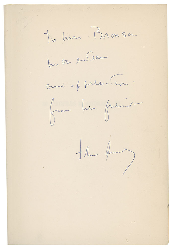 Signed book: Profiles in Courage. Later printing. NY: Harper & Brothers, 1956. Hardcover with dust jacket, 6 x 8.5, 266 pages. Signed and inscribed on the first free end page in blue ballpoint, "To Mrs. Bronson, with esteem and appreciation from her friend—John Kennedy." Autographic condition: fine. Book condition: VG+/VG, with a small repaired edge tears and creases to the price-clipped dust jacket, and a "Library of Lawrence E. Miller" blindstamp to the last page.