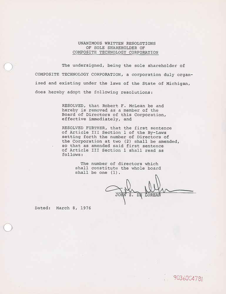 Executive in the U.S. automobile industry (1925-2005), and founder of the DeLorean Motor Company, best remembered for the DeLorean DMC-12 sports car, which was featured in the 1985 film Back to the Future. DS, one page, 8.5 x 11, March 8, 1976. A 'Unanimous Written Resolutions of Sole Shareholder of Composite Technology Corporation,' which resolves to remove Robert F. McLean as "a member of the Board of Directors of this Corporation, effective immediately." Signed at the conclusion in black ballpoint by John DeLorean. In fine condition, with two file holes to the left side, and a light diagonal crease passing through the tail to the signature.
