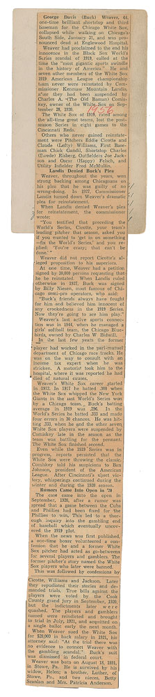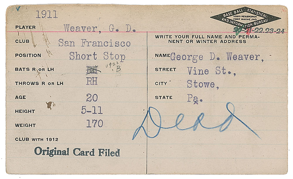 Professional baseball player (1890-1956) who was one of the eight players banned from the Major Leagues for his connection to the 1919 Black Sox Scandal. Louis Heilbroner Baseball Statistical and Information Bureau card, 5 x 3, filled out on the reverse in black ink by Buck Weaver. The card front features typed information relating to Weaver’s 1911 season with the San Francisco Seals minor league team, with Weaver correcting his batting stance in pencil and adding “1920 B”; on the reverse Weaver writes the names of the various clubs he played for from 1910 to 1920: “1910 Cleveland N.T, 1910 Northampton York, 1910 Chicago A. N.T, 1911 San Francisco, 1911 Chicago A." Weaver writes "19" and "20," indicating that he was still with Chicago. Another hand has added “Dead” to the front, and the reverse features an affixed article mentioning Weaver’s death in 1956. In fine condition. Louis Heilbroner (1861-1933), a one-time manager for the St. Louis Cardinals, was a pioneer in baseball statistics who in 1909 founded Heilbroner's Baseball Bureau Service, the first commercial statistical bureau dedicated to baseball, and began publishing the Baseball Blue Book.