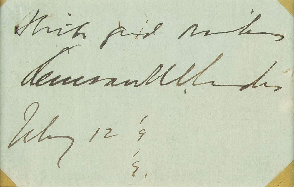 Fountain pen signature, "With good wishes, Kenesaw M. Landis, July 12, 1919,” on an off-white 4.75 x 3 sheet. Matted and framed with a portrait and Hall of Fame card to an overall size of 13.75 x 16.75. In very good to fine condition, with old tape in each corner.