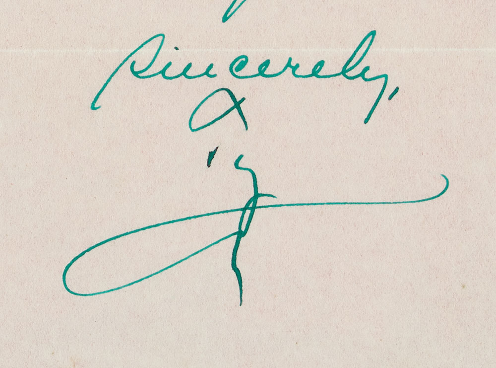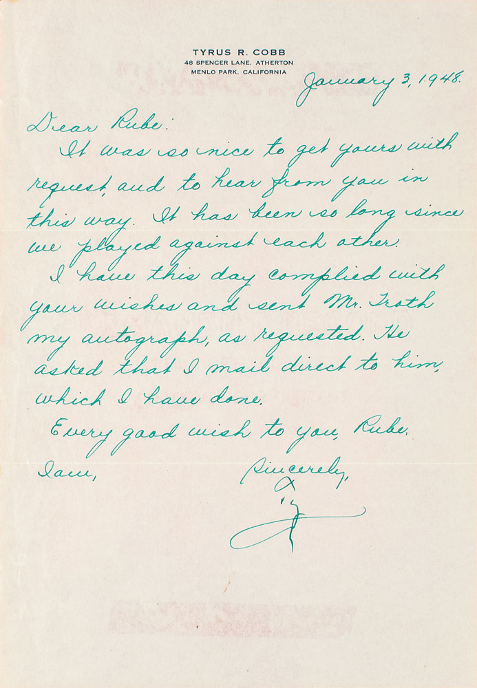 ALS signed “Ty,” one page, 7.25 x 10.5, personal letterhead, January 3, 1948. Letter to former professional ballplayer Rube Oldring, in full: "It was so nice to get yours with request, and to hear from you in this way. It has been so long since we played against each other. I have this day complied with your wishes and sent Mr. Troth my autograph, as requested. He asked that I mail direct to him, which I have done. Every good wish to you, Rube." Mounted and framed to an overall size of 12 x 14.5. In fine condition, with light show-through at the top and bottom from tape on the reverse, apparently used to affix the letter to the mat. Accompanied by the original mailing envelope addressed in Cobb's hand.