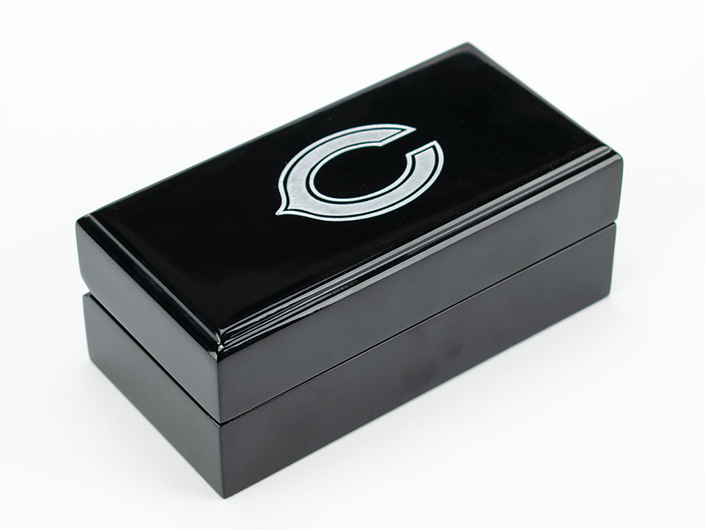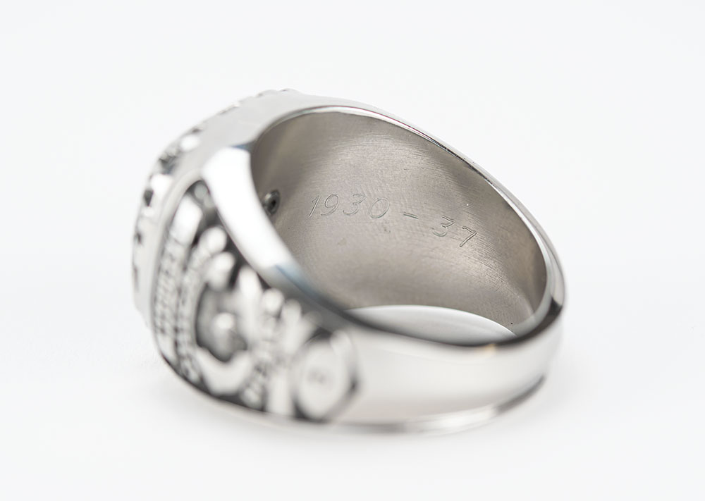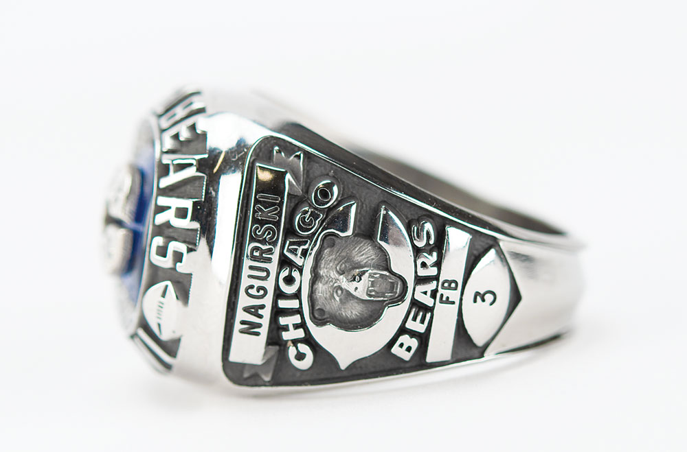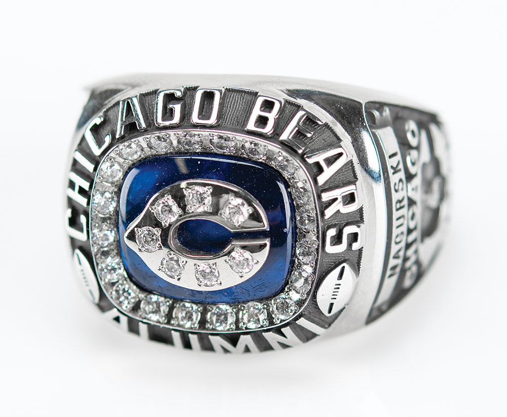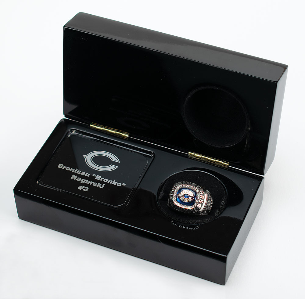 Attractive Chicago Bears commemorative ring presented to Hall of Fame tackle and fullback Bronko Nagurski at a 1989 Bears alumni dinner event. Made by Terryberry, the size 14 ring is bejeweled with 27 sapphires with the top featuring the Bears “C” logo and encircled text: “Chicago Bears Alumni.” One shank depicts an image of Coach George Halas, and the other shows the Bears logo between Nagurski’s surname, position, and number. The inside of the band is engraved “1930-1937,” indicating Nagurski’s tenure as a Chicago Bear. Includes the original black presentation case. In fine condition.