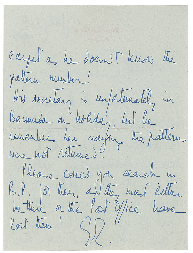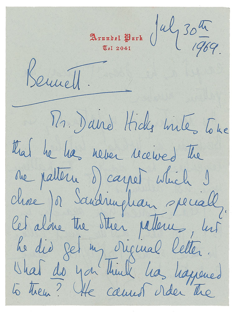 ALS signed “ER,” one page both sides, 5.25 x 7, Arundel Park letterhead, July 30, 1969. Letter to "Bennett," in full: "Mr. David Hicks writes to me that he has never received the one pattern of carpet which I chose for Sandringham specially, let alone the other patterns, but he did get my original letter. What do you think has happened to them? He cannot order the carpet as he doesn't know the pattern number! His secretary is unfortunately in Bermuda on holiday, but he remembers her saying the patterns were not returned. Please could you search in B. P. [Buckingham Palace] for them, as they must either be there or the Post Office have lost them!" In fine condition.