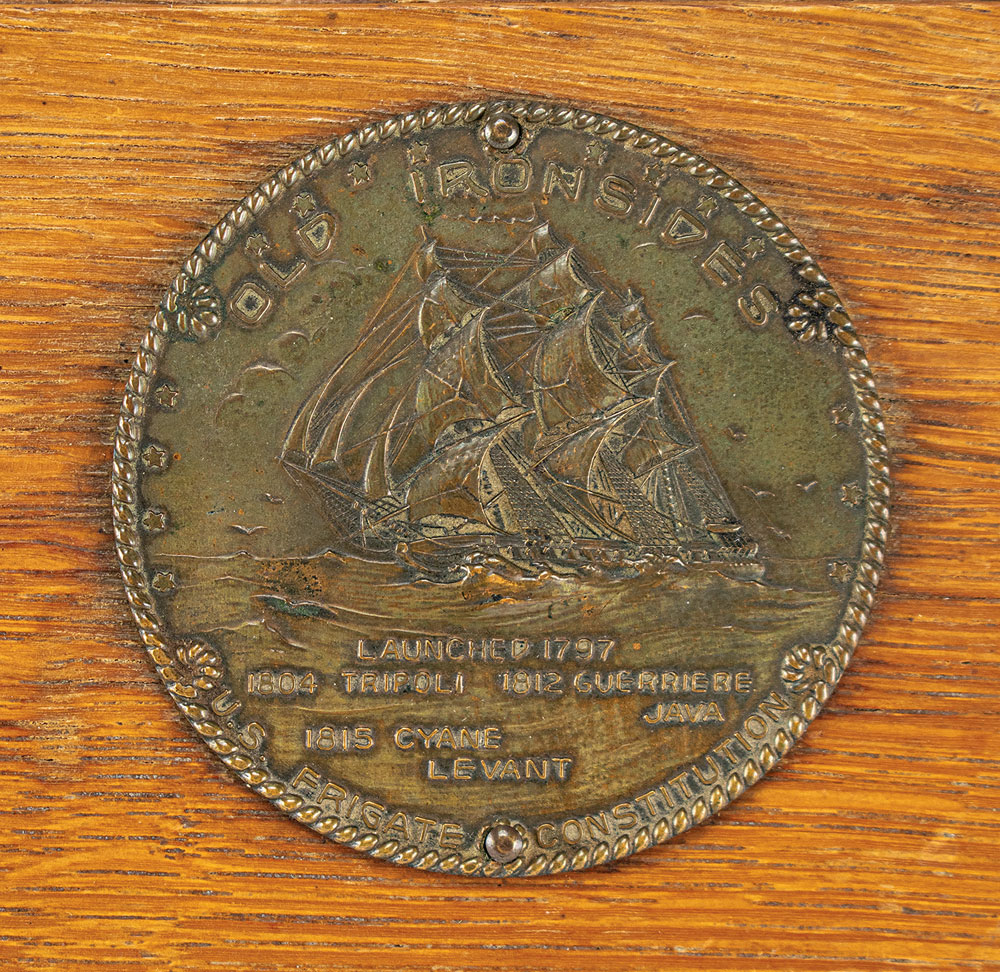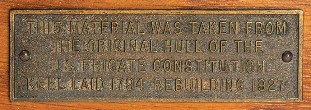 Very attractive display box constructed of wood removed from the hull of the USS Constitution during the frigate's historic 1927 restoration, measuring 7.25 x 4.25 x 2.5, with the box front bearing the original bronze plate, which reads: "This material was taken from the original hull of the U.S. Frigate Constitution, Keel laid 1794, Rebuilding 1927." The handsome box lid features a 2.5″ diameter bronze emblem with embossed image of “Old Ironsides” with its sails up, with raised text below: "Launched 1797, 1804 Tripoli, 1812 Guerriere, Java, 1813 Cyane, Levant, U.S. Frigate Constitution." Base of box bears an affixed period caption detailing the history and restoration of the USS Constitution, in part: “’Old Ironsides’ champion of American Liberty, is being completely rebuilt in the Navy Yard at Boston, Massachusetts. A floating relic, restored to her former glory, she will visit the ports of our country, an inspiration and a lasting lesson. In patriotism to all who see her.” In fine condition.
