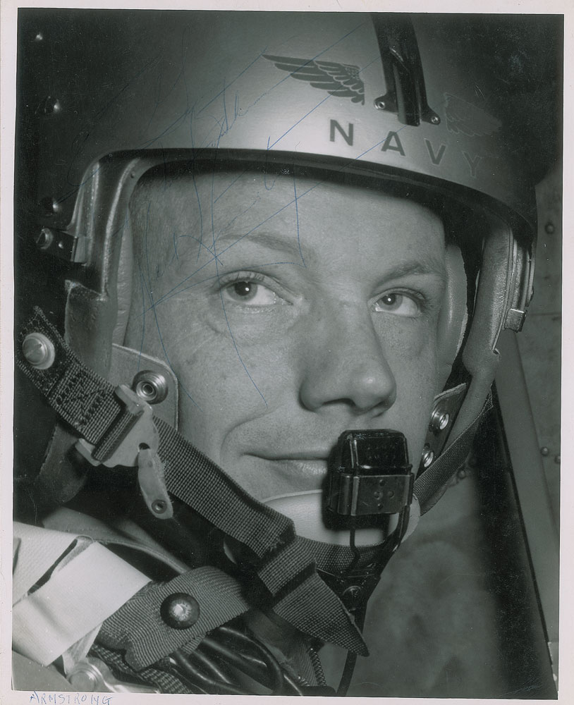 Extraordinary vintage glossy 8 x 10 close-up photo of Armstrong as a young pilot with the United States Navy, signed and inscribed in blue ballpoint, "To George, with best wishes, Neil Armstrong.” Reverse bears an "Official Navy Photograph" stamp, which credits the photo to George Franchois. In fine condition, with poor-to-moderate handwriting contrast, and a collector's notation in the bottom border. In 1947, at the age of 17, Armstrong began studying aeronautical engineering at Purdue University and earned a Bachelor of Science degree in Aeronautical Engineering in 1955. A call-up from the Navy interrupted his studies on January 26, 1949, which led to Armstrong's eventual promotion as a fully qualified naval aviator and then to his joining the National Advisory Committee for Aeronautics (NACA) in 1955. A magnificently rare and early signed portrait of history's first moonwalker.