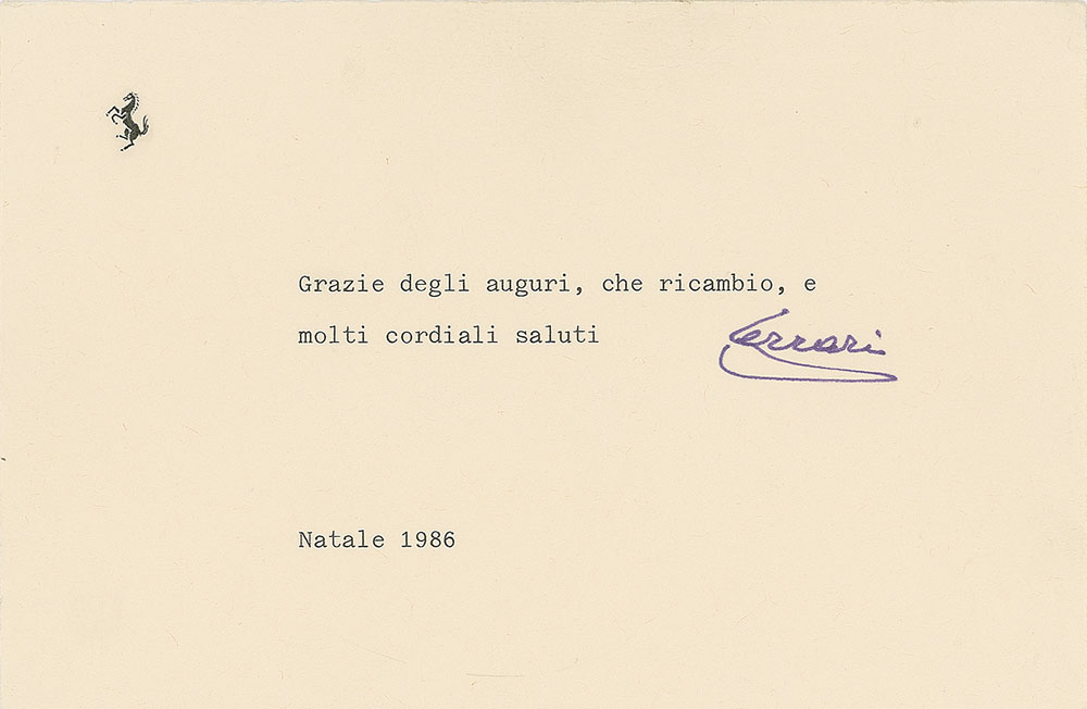 TNS in Italian, signed “Ferrari,” one page, 6.25 x 4, personal stationery card, Christmas 1986. In full: "Thanks for the good wishes, which I reciprocate, and best regards." In fine condition, with some light creasing. Accompanied by the original mailing envelope.