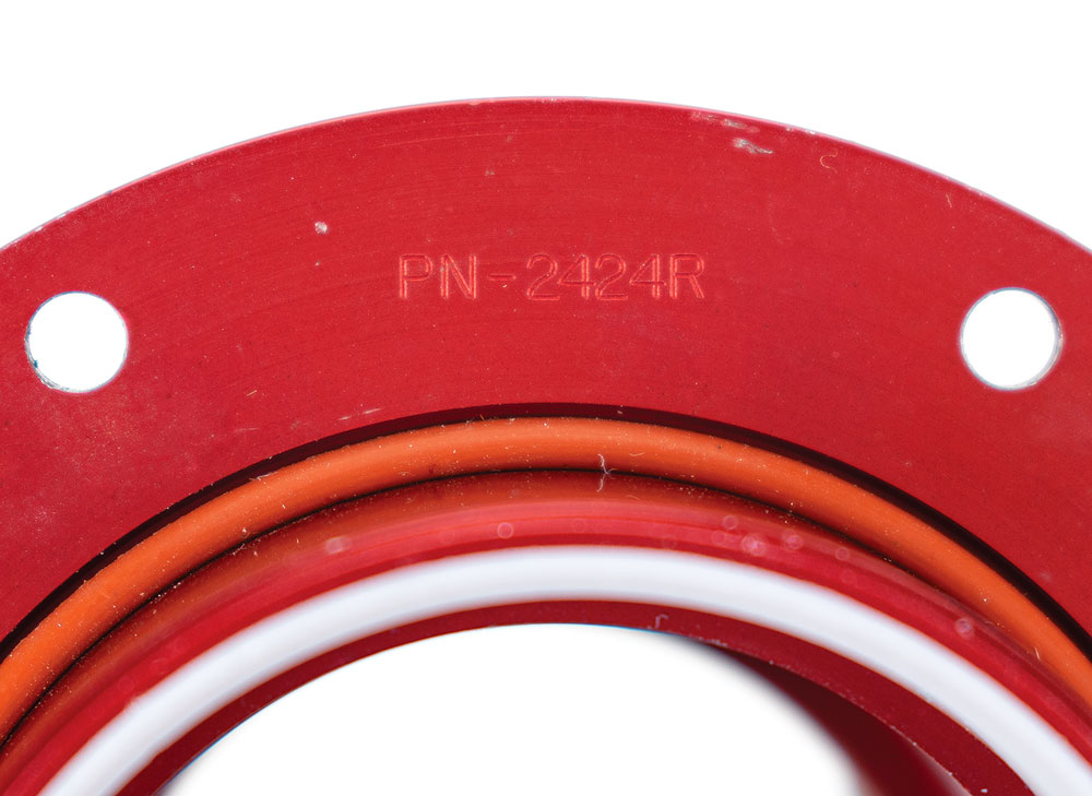 Red connector with locking tab as used on the A7L and A7LB lunar mission pressure suits (lower left gas connector), 2.75 x 1.75, made by Airlock and engraved with part numbers: “Assy. A6L-101023-08, SN-1010, Assy. 9192,” with the underside marked: “PN-2424R, SN-1010.” In fine condition.