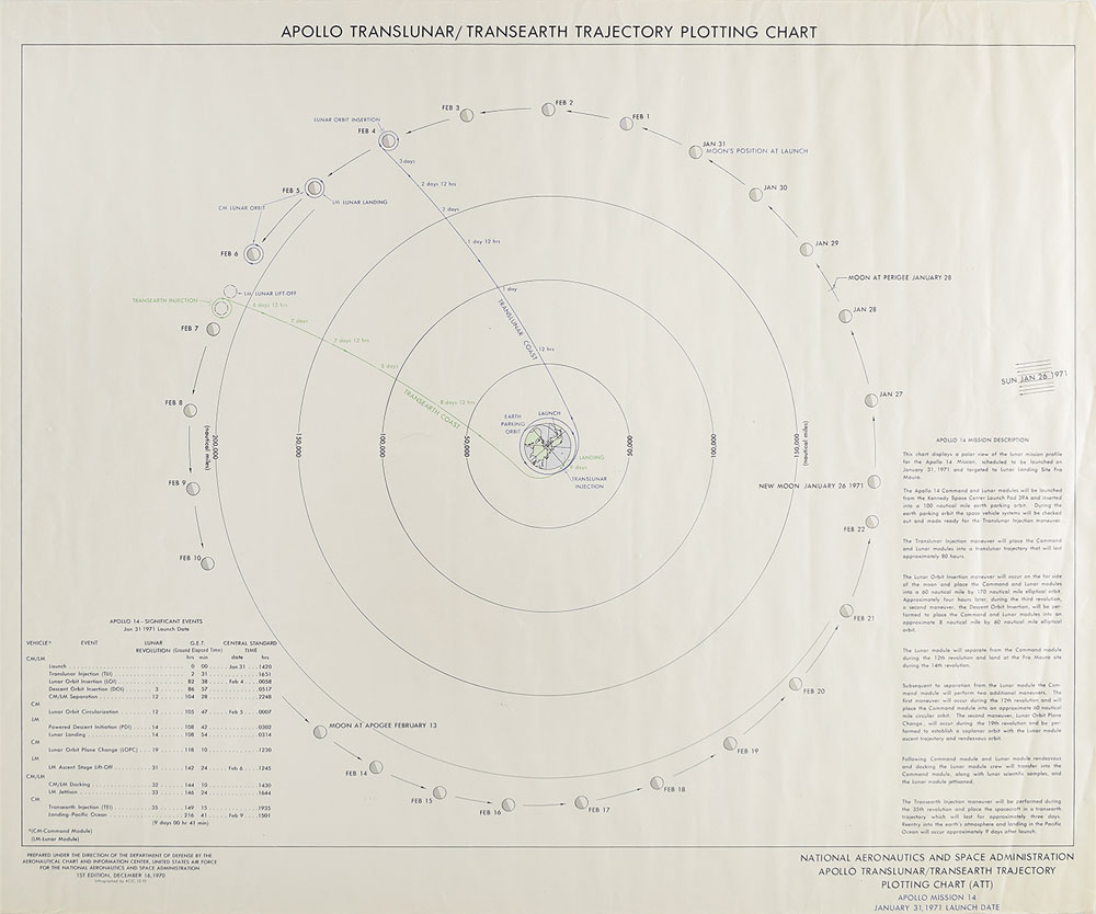 Color first edition Translunar/Transearth Trajectory Plotting Chart for the Apollo 14 mission, 24 x 20, dated December 16, 1970, displaying a polar view of the lunar mission profile for Apollo 14, showing the various significant events during the nine-day mission. Lithographed by ACIC 12-70 and prepared under the direction of the Department of Defense by the Aeronautical Chart and Information Center. Rolled and in fine condition, with light vertical folds and some creases.