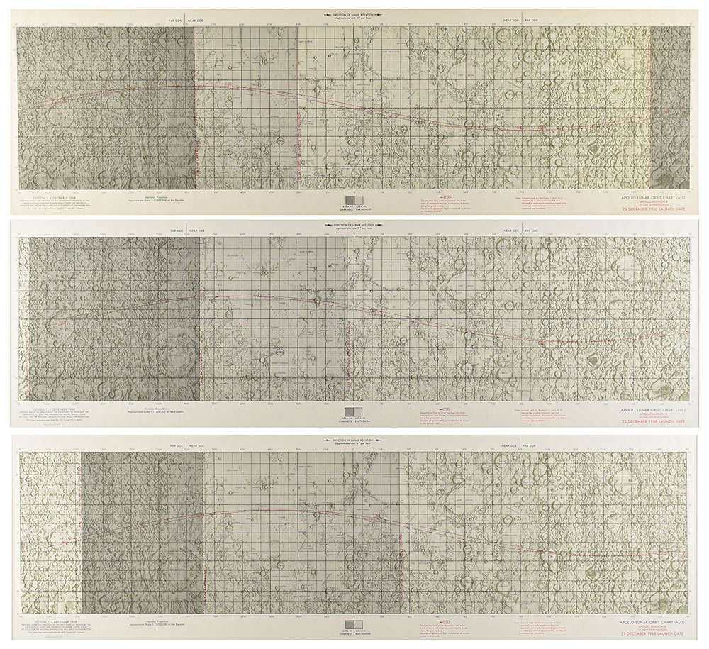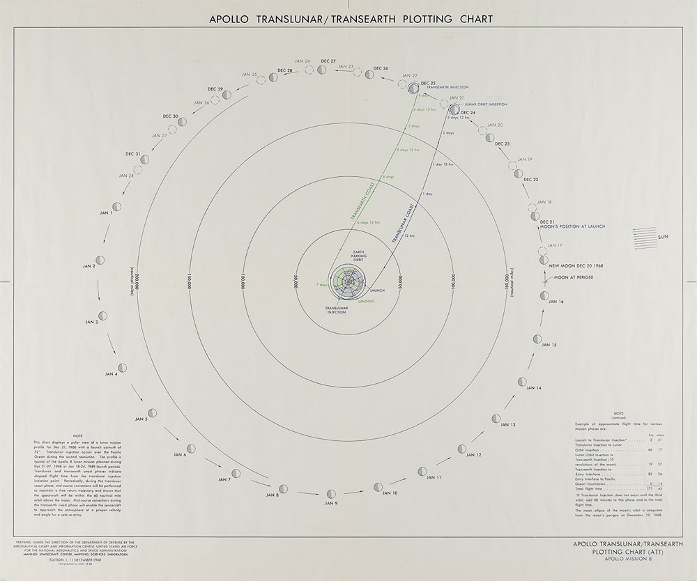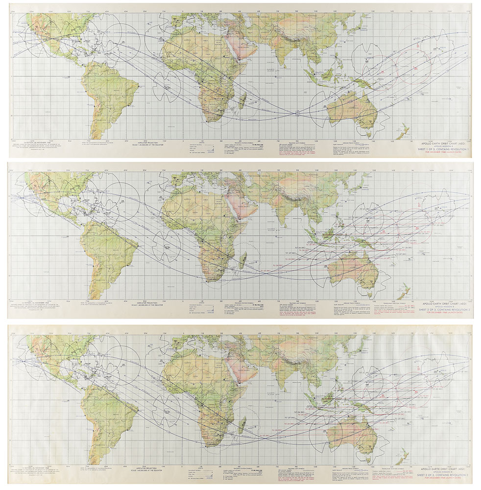 Grouping of seven color first edition charts for the Apollo 8 mission, ranging in size from 24 x 20 to 41.5 x 13.5, which includes: an Apollo Translunar/Transearth Plotting Chart, dated December 11, 1968; a set of three Earth Orbit Charts, sheet 1 and sheet 2 (2), dated November 26, 1968; and a set of three Lunar Orbit Charts (1st and 10th revolutions), with differing launch dates of December 21, 23, and 25, 1968. Each prepared under the direction of the Department of Defense by the Aeronautical Chart and Information Center. Rolled and in overall fine condition, with scattered creases and some wear to edges.