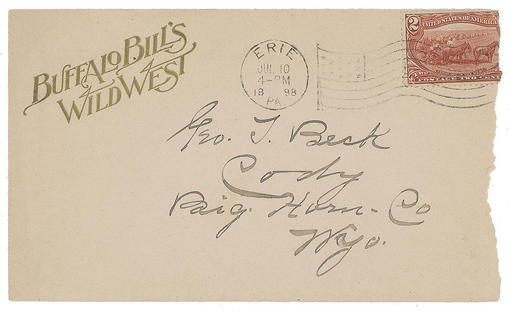Attractive 'Buffalo Bill's Wild West' mailing envelope, 6 x 3.75, addressed in Cody's hand to "Geo. T. Beck, Cody, Big Horn Co., Wyo." Postmarked at Erie, Pennsylvania, on July 10, 1898. Also included is a 'Buffalo Bill's Wild West and Congress of Rough Riders of the World' envelope, with portraits of Cody and Nate Salsbury, postmarked March 9, 1898, and a 'Colonel Wm. F. Cody (Buffalo Bill)' envelope, with portrait of Cody and postmark dated to September 6, 1910, addressed nicely in the hand of Buffalo Bill's Arizona mining partner, John D. Burgess. In very good to fine condition.