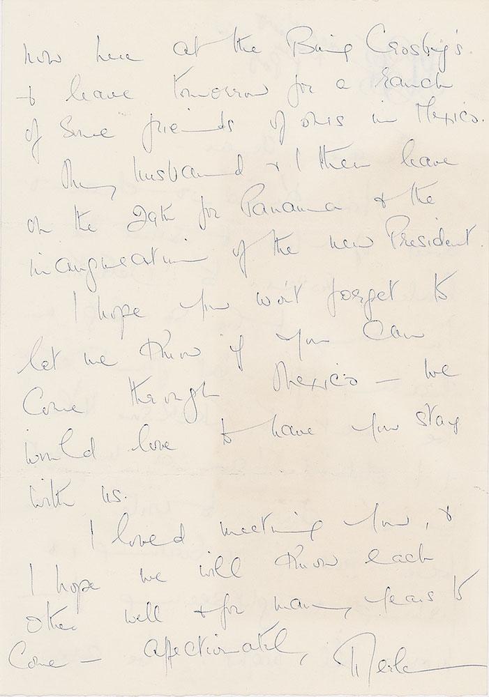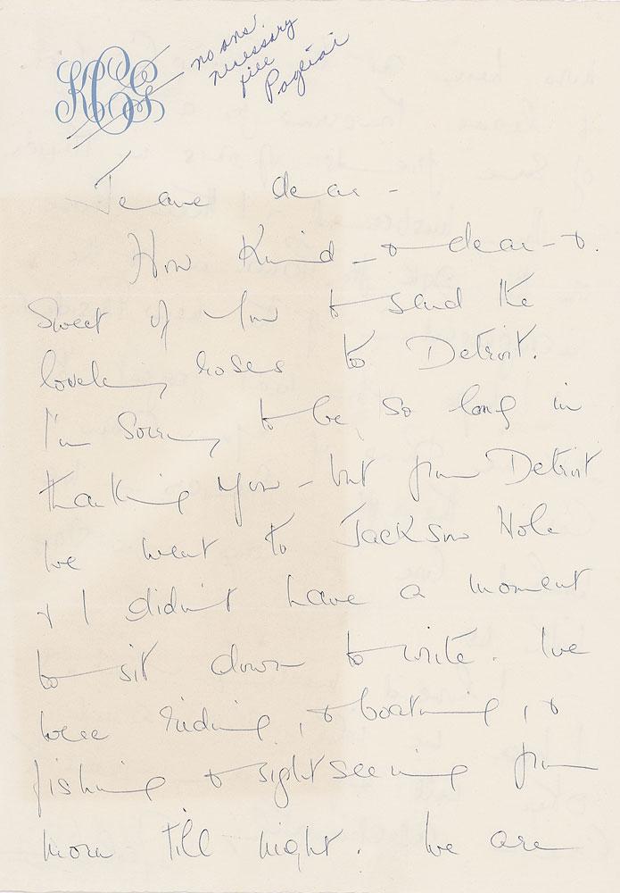 ALS signed “Merle,” one page both sides, 7.25 x 10.5, 'KCG' monogrammed letterhead, September 21, 1968. Letter to psychic celebrity astrologist Jeane Dixon, in full: "How kind & dear & sweet of you to send the lovely roses to Detroit. I’m sorry to be so long in thanking you, but from Detroit we went to Jackson Hole & I didn’t have a moment to sit down to write. We were riding, & boating & fishing & sightseeing from morn till night. We are now here at the Bing Crosby’s & leave tomorrow for a ranch of some friend of his in Mexico. My husband & I then leave on the 29th for Panama & the inauguration of the new president. I hope you won’t forget to let me know if you can come through Mexico—We would love to have you stay with us. I loved meeting you & I hope we will know each other well & for many years to come." In fine condition, with a light block of toning to the first page. Accompanied by the original mailing envelope and by a carbon copy of Dixon’s original letter to Oberon from September 11, 1968, care of Henry Ford II at Grosse Pointe, Michigan.