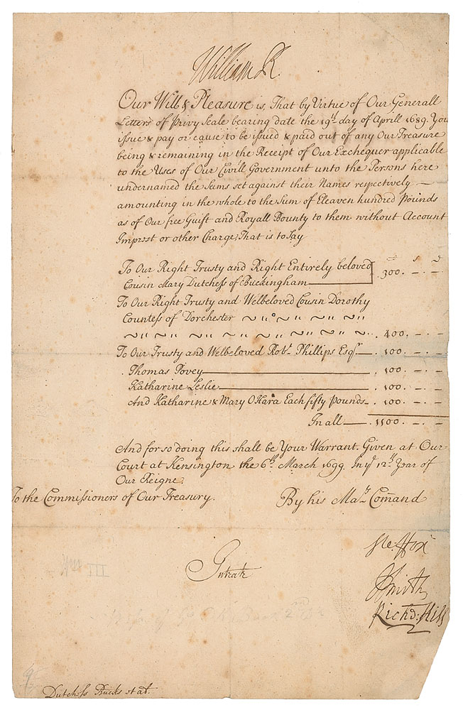 Sovereign Prince of Orange (1650-1702) who served as King of England, Scotland, and Ireland from 1689 until his death. Manuscript DS, signed “William R.,” one page, 8.75 x 13.75, March 6, 1699. Document issued "To the Commissioners of Our Treasury" asking them "by vertue of our Generall Letters of Privy Seale bearing the date the 19th day of Aprill 1689?to pay?Our Right Trusty and Right Entirely beloved Cousin Mary Dutchess of Buckingham £300?Well beloved Cousin Dorothy Countess of Dorchester £400?Welbeloved Robt. Phillips Esq. £100, Thomas Povey £100, Katharine Leslie £100, And Katharine & Mary O Hara Each Fifty pounds. In all £1,100." Signed in the upper border by King William III, and countersigned at the conclusion by treasury commissioners Stephen Fox, John Smith, and Richard Hill. In very good to fine condition, with scattered light foxing, and a clipped lower right corner. Interestingly, Thomas Povey (1613—1705), a merchant-politician who is being paid £100, was sometimes called England’s 'First Colonial Civil Servant.' His son-in-law, Giles Bland, was executed for treason in Virginia in 1677, having played a leading part in Bacon's Rebellion in the previous year.