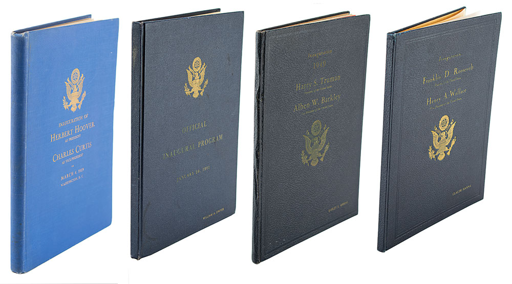 Collection of four deluxe hardcover inauguration programs, including: Herbert Hoover and Charles Curtis (1929); Franklin D. Roosevelt and Henry A. Wallace (1941); Harry S. Truman and Alben W. Barkley (1949); and John F. Kennedy and Lyndon B. Johnson (1961). In very good to fine condition, with a broken front hinge to the JFK program.