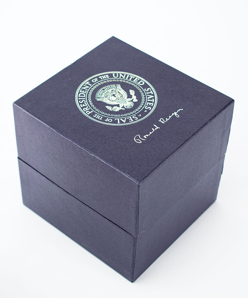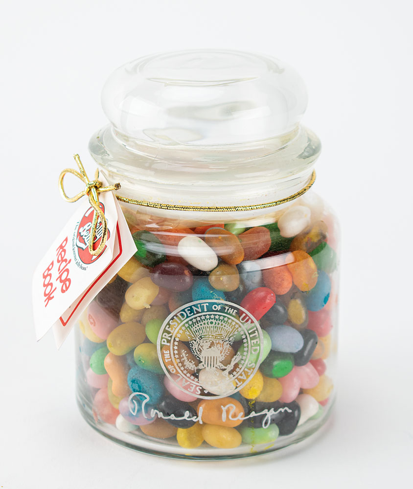 Desirable 5.5″-tall jar full of Jelly Belly jelly beans from Ronald Reagan's presidency, featuring the presidential seal and Reagan's facsimile signature on the front. Includes the original navy blue gift box, also gilt-stamped on the lid with the presidential seal and facsimile signature. In fine condition, with some cracks to the box's red plastic liner.