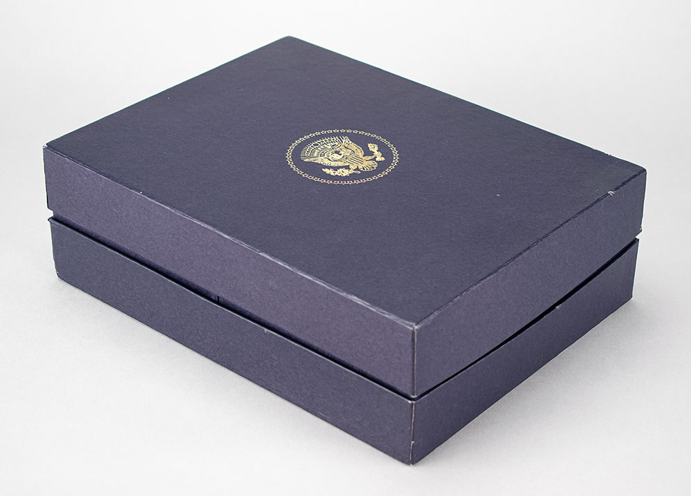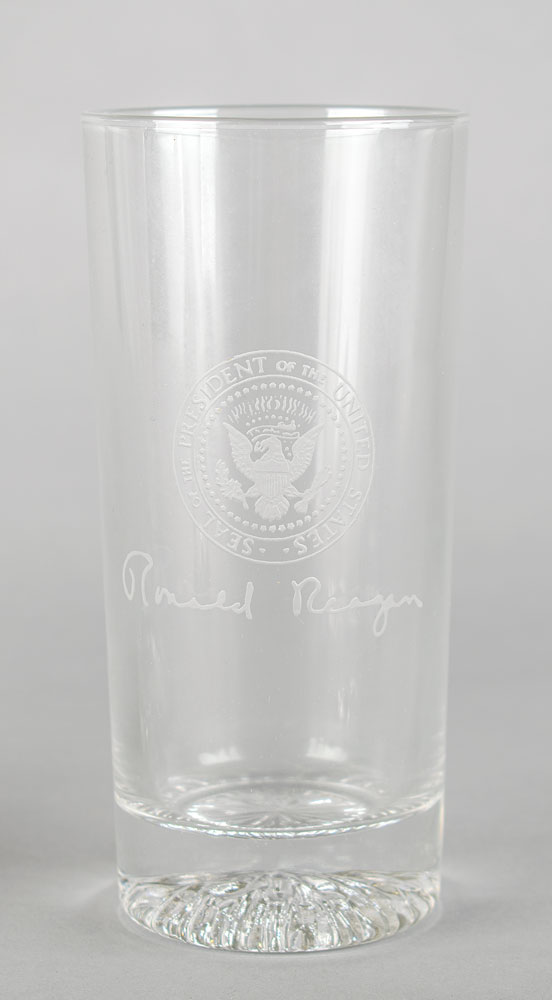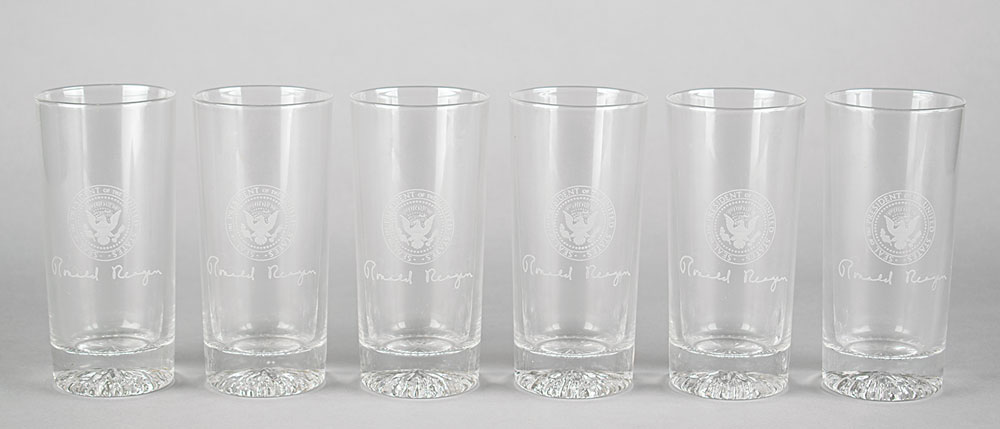 Set of six 5.5″-tall drinking glasses, each etched on the front with the presidential seal and Ronald Reagan's facsimile signature. Housed in their original navy blue presentation box, gilt-stamped on the lid with the presidential seal. In fine condition.