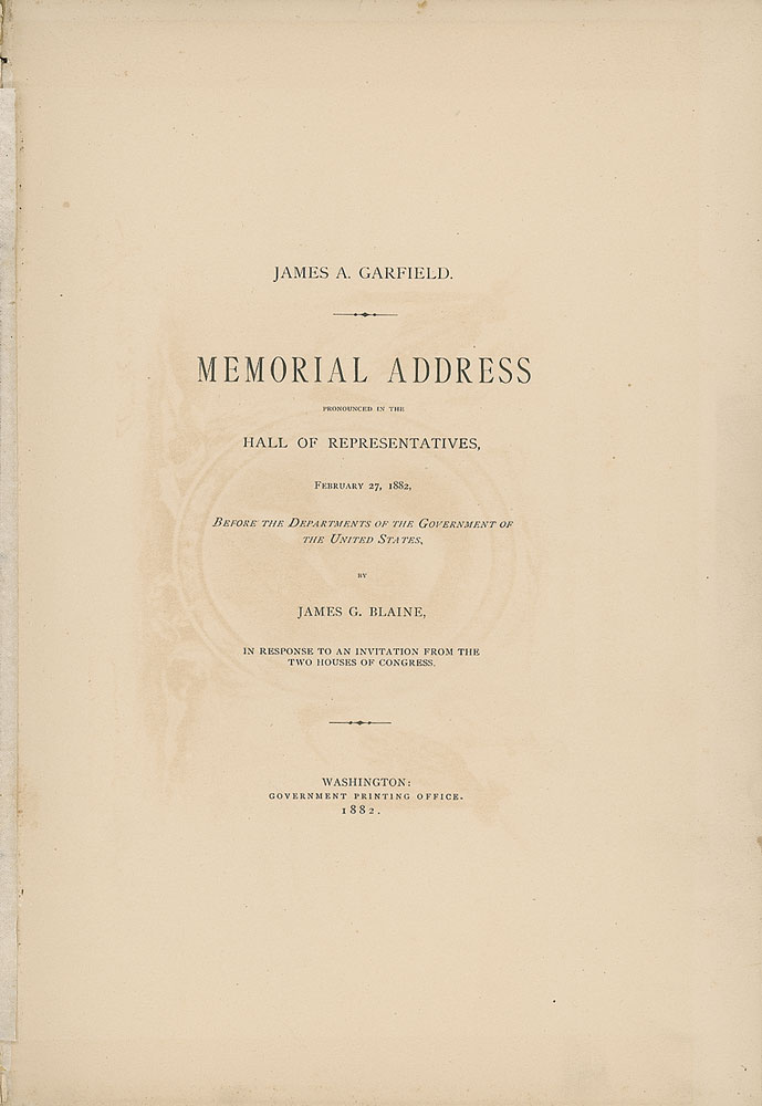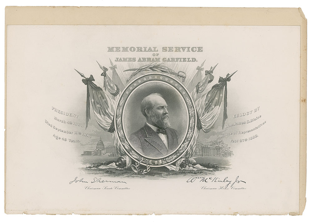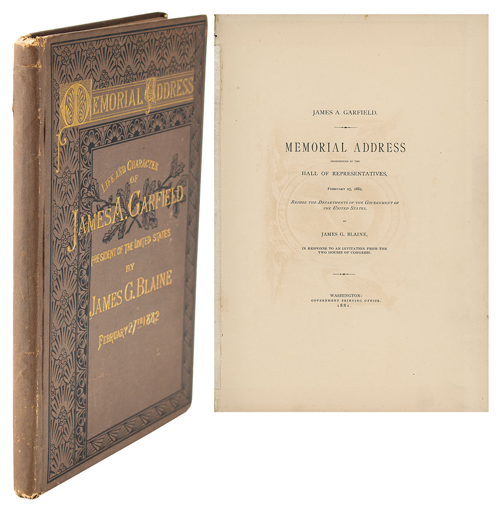 Desirable unsigned book: Memorial Address: Life and Character of James A. Garfield, President of the United States, by James G. Blaine, February 27th, 1882. Washington: Government Printing Office, 1882. Hardcover bound in brown cloth with gilt lettering and black decoration, 8 x 11.75, 87 pages. Detached but laid in as the frontispiece is a memorial engraving featuring Garfield at center, bearing the facsimile signatures of William McKinley and John Sherman. In very good condition, with light cover wear, a cracked front hinge, and the page holding the Garfield engraving detached but present.