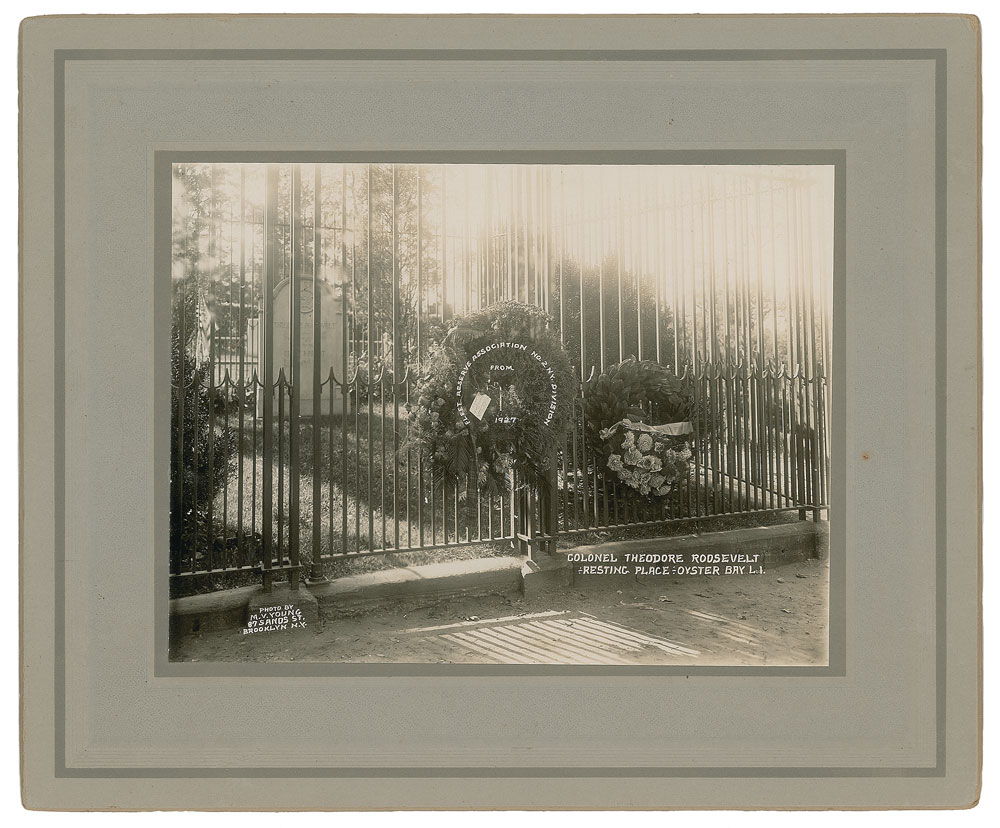 Interesting 8 x 6.25 photo of the Long Island grave site of Theodore Roosevelt, affixed to a 12 x 10 mount, showing a wreath on the gate marked: "Fleet Reserve Association, No. 2, N.Y. Division, from 1927." Additional caption and credit text inherent to the image reads: "Colonel Theodore Roosevelt, Resting Place, Oyster Bay, L.I." and "Photo by M. V. Young, 87 Sands St., Brooklyn, N.Y." In fine condition.