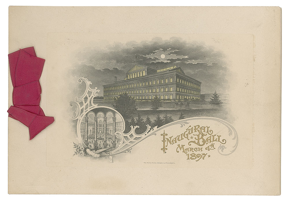 Ornate ribbon bound 10 x 7 program for the inaugural ball of President William McKinley and Vice President Garret Hobart, held at the Pension Office on March 4, 1897, containing three engraved plates on heavy cardstock boards: one featuring jugate portraits of McKinley and Hobart; one listing the members of the event's executive committee; and one representing Ohio and New Jersey (home states of McKinley and Hobart). In fine condition.