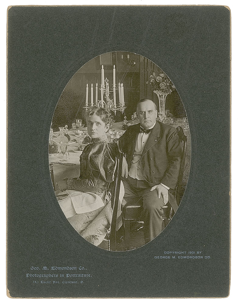 Appealing oval 3.75 x 5.25 albumen portrait of William and Ida McKinley seated at a dining table by George Edmonson, affixed to its original 6 x 8 studio mount. In fine condition.