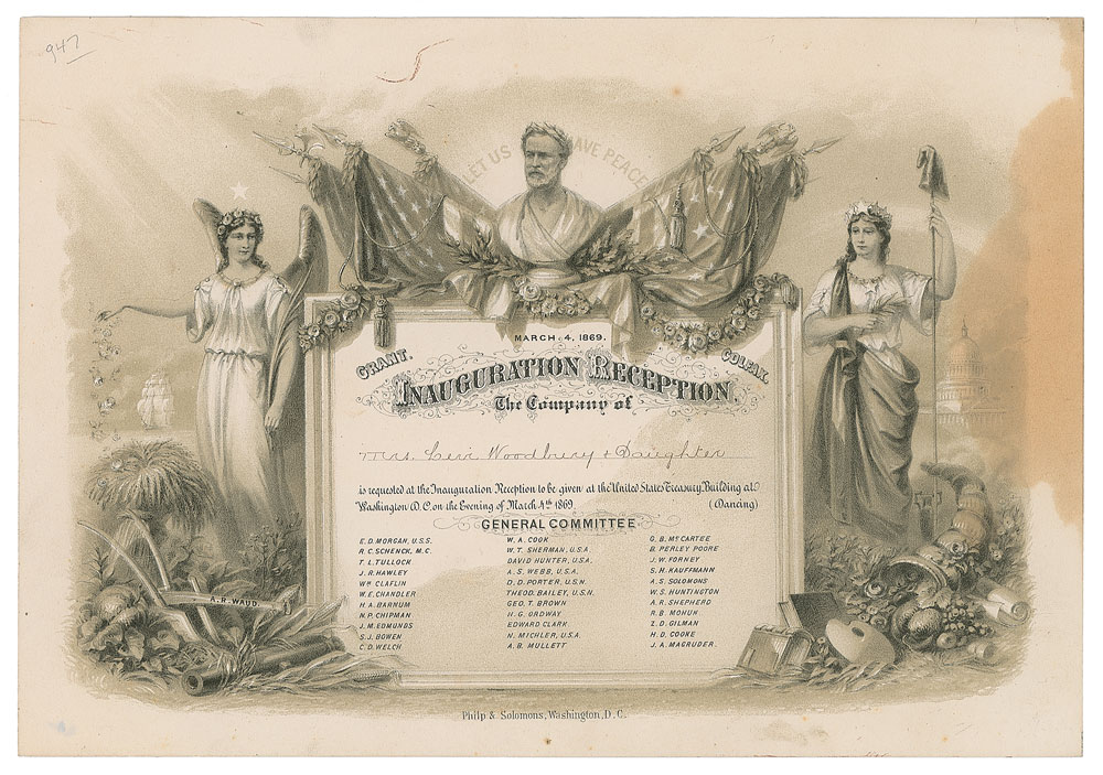 Official engraved invitation to the inauguration reception held for President Ulysses S. Grant and Vice President Schuyler Colfax at the Treasury Building on March 4, 1869, 10 x 7, issued to the widow of a former Supreme Court justice, "Mrs. Levi Woodbury & Daughter." The invitation names the members of the general committee, including Civil War heroes William T. Sherman, Alexander S. Webb, and David D. Porter. In very good condition, with a stain to the right edge.