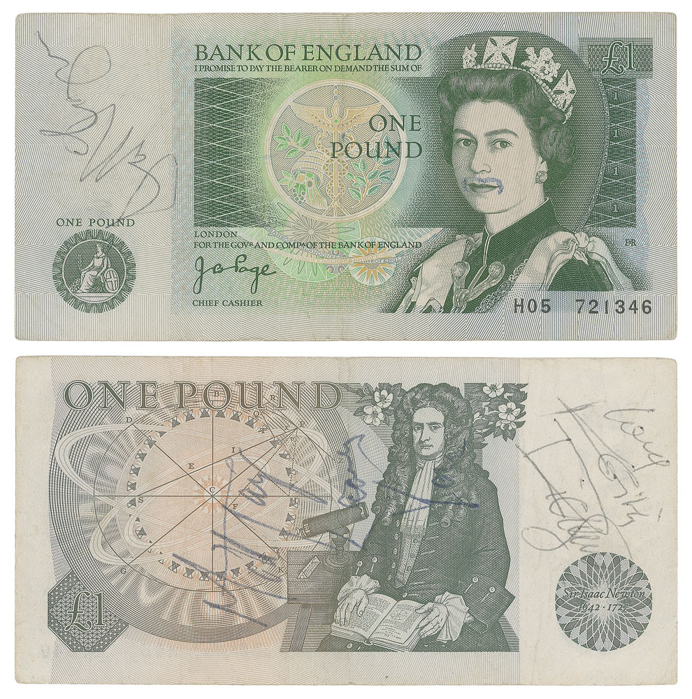 A one pound British note, 5.25 x 2.5, signed in black ink, "Mick Jagger, Thank you," and in black ballpoint, "Love, Keith Richards." The reverse is signed in black ballpoint by frequent Rolling Stones collaborator Ian McLagan. In very good to fine condition, with overall creasing and a central vertical fold.