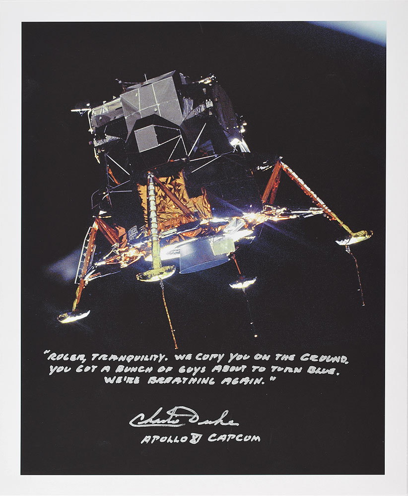 Very attractive color 12.5 x 15.5 photographic print of the Apollo 11 Lunar Module Eagle, signed nicely in silver ink, "'Roger, Tranquility. We copy you on the ground. You got a bunch of guys about to turn blue. We’re breathing again.' Charlie Duke, Apollo XI, CAPCOM." In very fine condition. Duke's words were the first spoken from Earth to someone on another world.