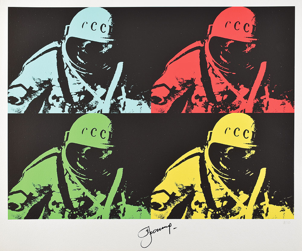 Rare limited edition color 23.5 x 19.75 lithograph of Alexei Leonov when he became the first human to conduct a spacewalk, depicting the legendary cosmonaut in an Andy Warhol-style quadrant format, numbered 8/10, signed in the lower border in black felt tip by Leonov. In very fine condition. A decidedly rare edition given that only 10 were ever produced.