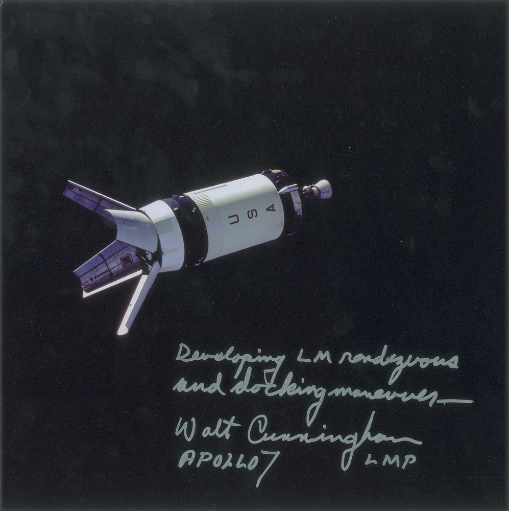 Color satin-finish 12 x 12 photo of the upper stage booster of the S-IVB, viewed by the Apollo 7 astronauts while they performed practice docking maneuvers, signed in silver ink, "Developing LM rendezvous and docking maneuvers—Walt Cunningham, Apollo 7 LMP." In very fine condition.