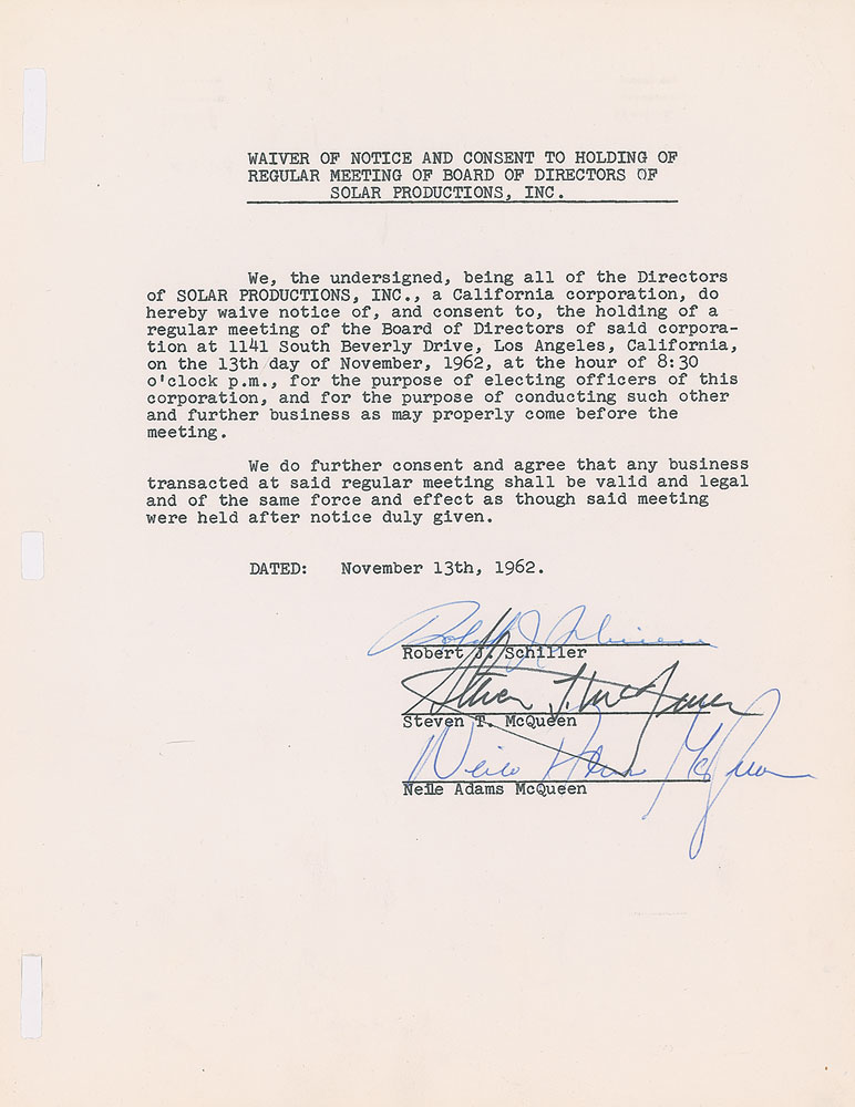 DS, signed “Steven T. McQueen,” one page, 8.5 x 11, November 13, 1962. A waiver of notice and consent to the holding of a regular meeting by the board of directors of Solar Productions, Inc., for the purpose of electing officers and conducting other business. Signed at the conclusion in black ink by McQueen, and countersigned by Robert J. Schiller and McQueen's first wife, Neile Adams. In fine condition.