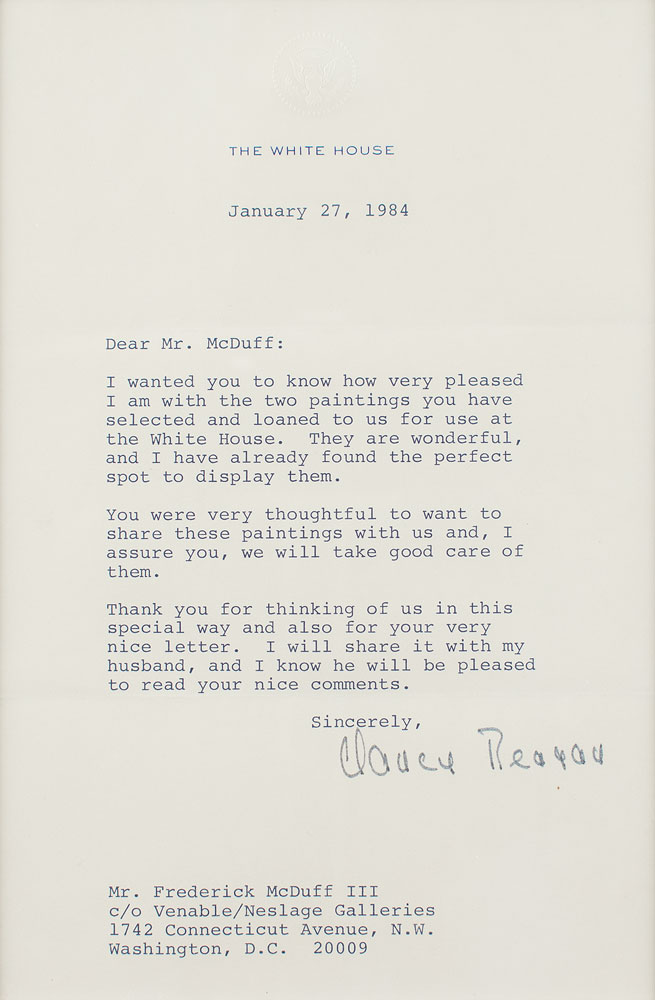 TLS signed "Nancy Reagan," one page, 6 x 9, White House letterhead, January 27, 1984, to Frederick McDuff III of Venable/Neslage Galleries, in part: "I wanted you to know how very pleased I am with the two paintings you have selected and loaned to us for use at the White House. They are wonderful, and I have already found the perfect spot to display them." Matted and framed to an overall size of 11 x 14.
