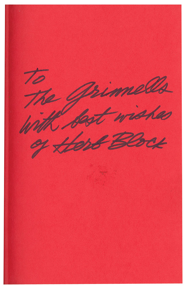 Signed book: Through the Looking Glass: The Reagan Years in Words and Pictures by Herblock. First edition. NY: W. W. Norton, 1984. Hardcover with dust jacket, 6.5 x 9.5, 287 pages. Signed and inscribed on the first free end page in black felt tip, "To the Grimmells, with best wishes of Herb Block."