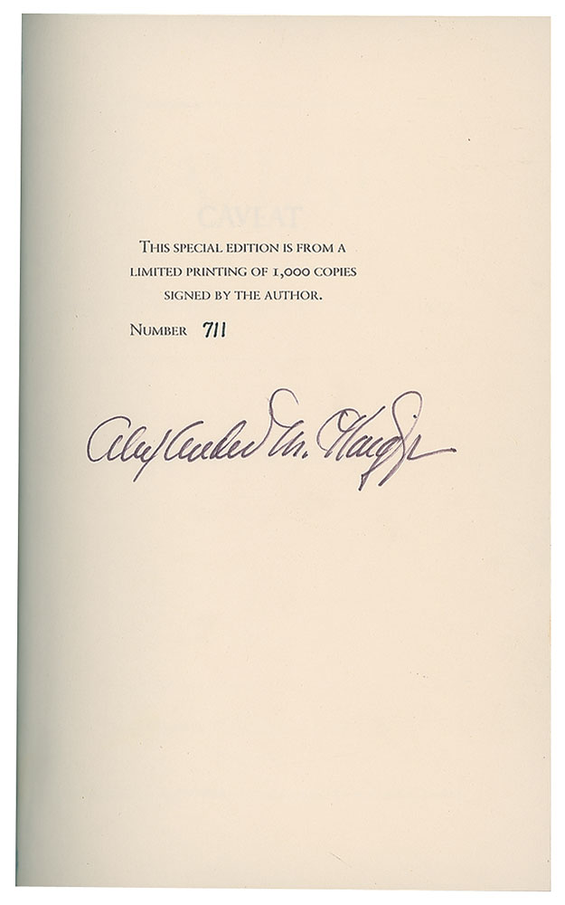 Signed book: Caveat. First edition, limited issue, numbered 711/1000. NY: Macmillan, 1984. Hardcover with slipcase, 6.25 x 9.5, 367 pages. Signed on the colophon in black felt tip, "Alexander M. Haig, Jr."