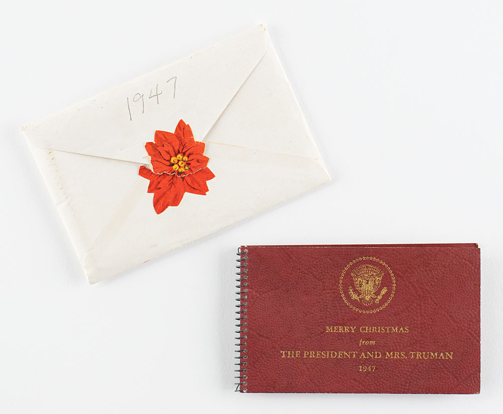 Attractive leather-bound pocket calendar given as a Christmas gift to White House staff by President Truman in 1947, 4.25″ x 2.75″, gilt-stamped on the front with the presidential seal and text, "Merry Christmas from the President and Mrs. Truman, 1947." Inside are three plastic sleeves, one containing a tiny year-long calendar for 1948; the other two were intended to hold identification cards. President Truman commissioned Brown and Bigelow of St. Paul to produce 760 of these pocket gifts, at a cost of eight cents each. In fine condition.