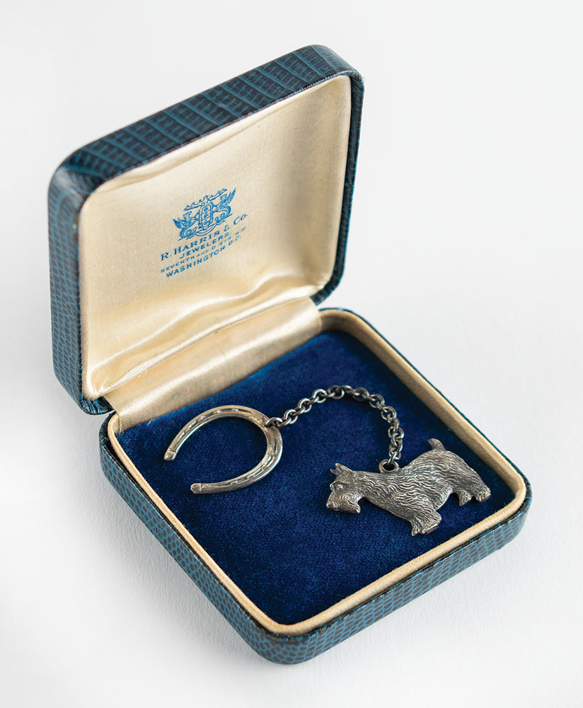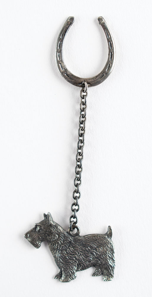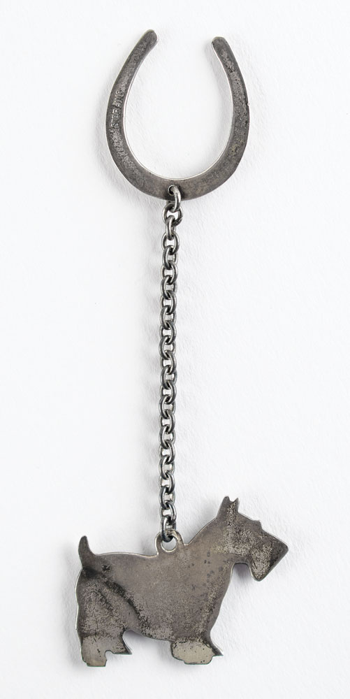 Appealing sterling silver key chain given to friends and White House staff as a Christmas gift by President Roosevelt in 1940, featuring a 1.25″ charm of his Scottish terrier Fala on one side, and a lucky horseshoe on the other. The back of the horseshoe is marked "Sterling." In 1940, FDR had his secretary Missy Le Hand order 212 sterling silver Scottie key chains from Hammacher Schlemmer of New York for $1 each. Fifteen were returned, leaving 197 in circulation. In fine condition.