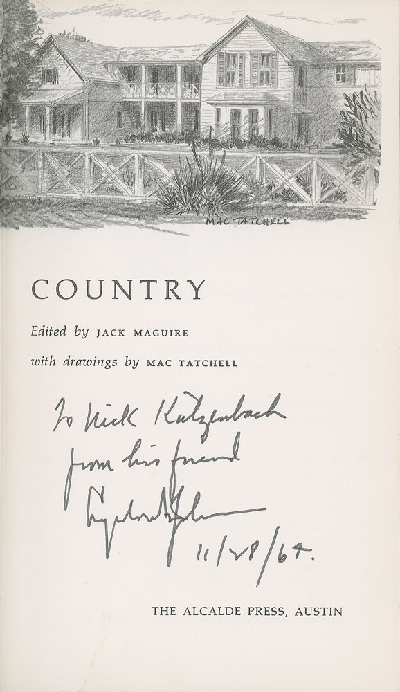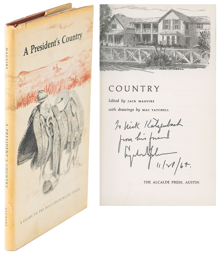 Signed book: A President's Country: A Guide to the Hill Country of Texas. First edition. Austin, TX: The Alcalde Press, 1964. Hardcover with dust jacket, 5.25 x 8.75, 80 pages. Signed and inscribed on the title page in black ink to his attorney general, "To Nick Katzenbach, from his friend, Lyndon B. Johnson, 11/28/64." In fine condition, with toning to the dust jacket edges and spine.