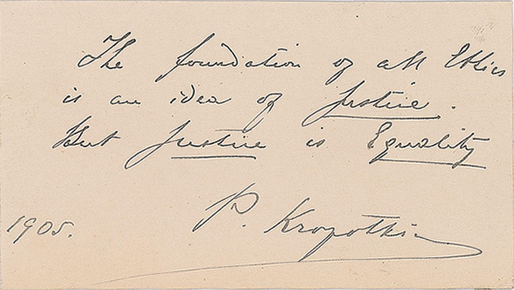Russian geographer, zoologist, and political theorist (1842-1921) best known for his advocacy of anarchist communism. AQS in fountain pen on an off-white 4.5 x 2.5 card, signed at the conclusion, "P. Kropotkin, 1905." The quote, in full: "The foundation of all Ethics is an idea of Justice. But Justice is Equality." In very fine condition, with old mounting remnants on the back.
