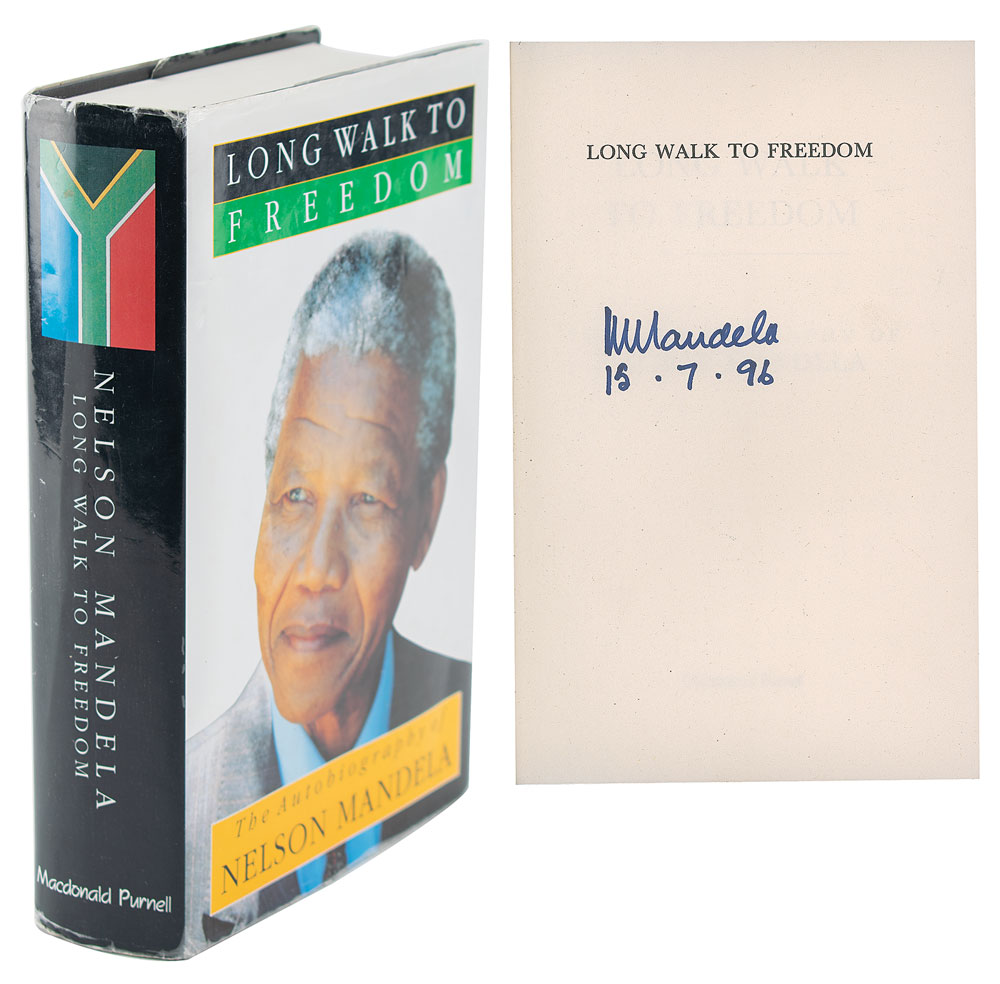 Signed book: Long Walk To Freedom: The Autobiography of Nelson Mandela. First edition. South Africa: MacDonald Purnell, 1994. Hardcover with dust jacket, 6.5 x 9.5, 630 pages. Signed on the half-title page in black felt tip, "N. Mandela, 15.7.96." In fine condition, with light wear and scuffing to the dust jacket. A desirable uninscribed first edition.