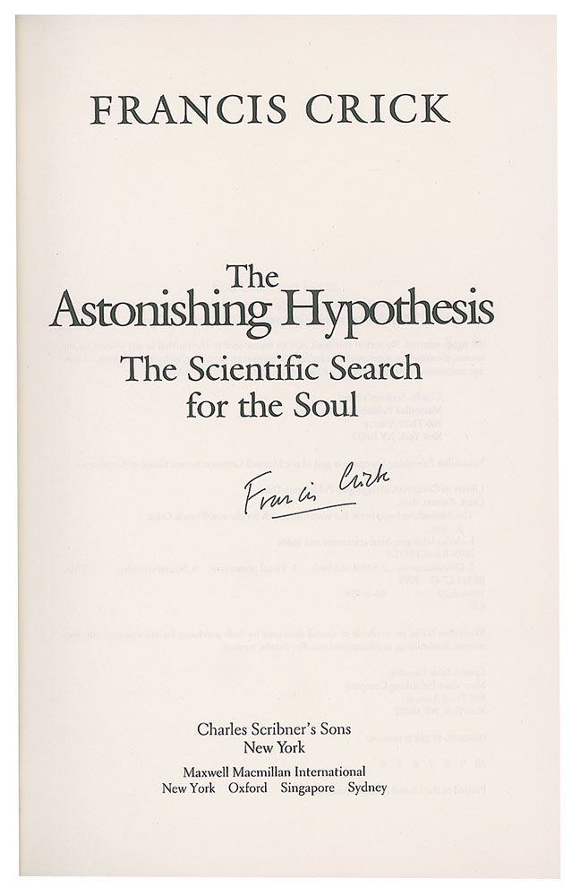 Two books: a later printing of The Astonishing Hypothesis: The Scientific Search for the Soul, hardcover with dust jacket, signed on the title page in black ink by Francis Crick; and a later printing of The Survival of the Wisest, hardcover with dust jacket, signed and inscribed on the half-title page in black ink, "For John & David Keppel—I'm sure you will see some resemblances, encouraging & hopeful, Jonas Salk, 9 Oct. 1978." In overall fine condition, with light wear to the Salk dust jacket.