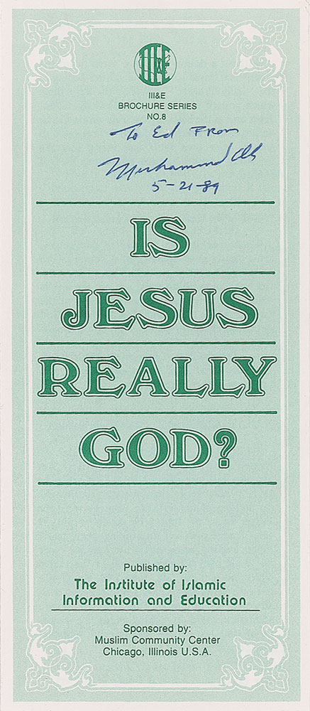 Tri-fold religious pamphlet entitled "Is Jesus Really God?," 3.75 x 8.5, signed and inscribed in black ballpoint, "To Ed from Muhammad Ali, 5-21-89." In very fine condition. From the collection of Dr. Lawrence E. Miller. From the collection of Dr. Lawrence E. Miller.